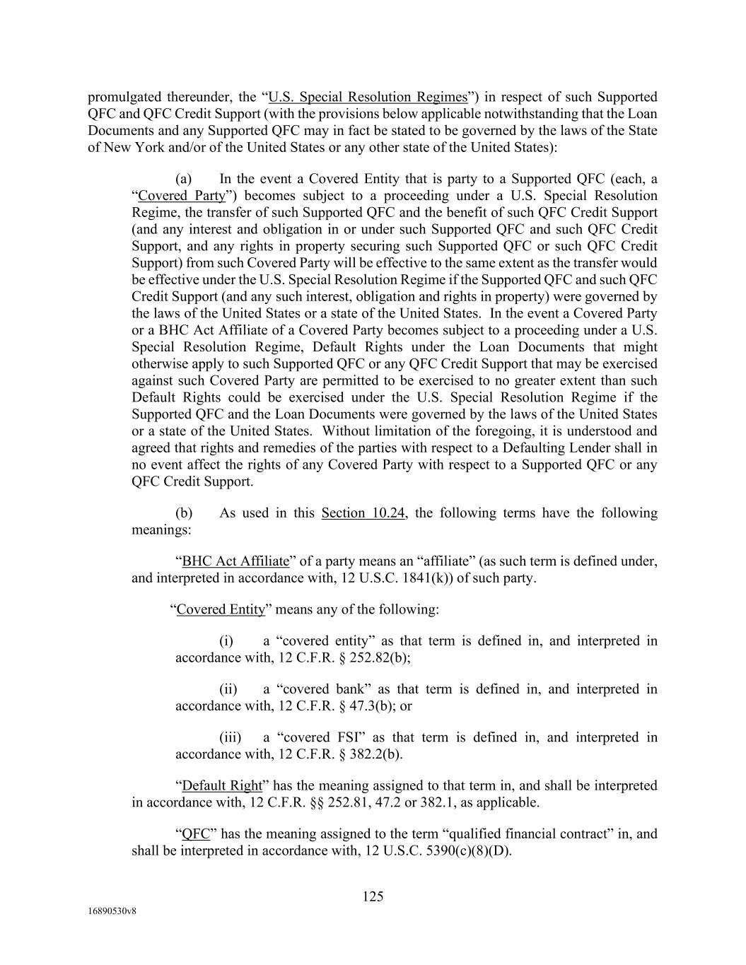 16890530v8 125 promulgated thereunder, the “U.S. Special Resolution Regimes”) in respect of such Supported QFC and QFC Credit Support (with the provisions below applicable notwithstanding that the Loan Documents and any Supported QFC may in fact be stated to be governed by the laws of the State of New York and/or of the United States or any other state of the United States): (a) In the event a Covered Entity that is party to a Supported QFC (each, a “Covered Party”) becomes subject to a proceeding under a U.S. Special Resolution Regime, the transfer of such Supported QFC and the benefit of such QFC Credit Support (and any interest and obligation in or under such Supported QFC and such QFC Credit Support, and any rights in property securing such Supported QFC or such QFC Credit Support) from such Covered Party will be effective to the same extent as the transfer would be effective under the U.S. Special Resolution Regime if the Supported QFC and such QFC Credit Support (and any such interest, obligation and rights in property) were governed by the laws of the United States or a state of the United States. In the event a Covered Party or a BHC Act Affiliate of a Covered Party becomes subject to a proceeding under a U.S. Special Resolution Regime, Default Rights under the Loan Documents that might otherwise apply to such Supported QFC or any QFC Credit Support that may be exercised against such Covered Party are permitted to be exercised to no greater extent than such Default Rights could be exercised under the U.S. Special Resolution Regime if the Supported QFC and the Loan Documents were governed by the laws of the United States or a state of the United States. Without limitation of the foregoing, it is understood and agreed that rights and remedies of the parties with respect to a Defaulting Lender shall in no event affect the rights of any Covered Party with respect to a Supported QFC or any QFC Credit Support. (b) As used in this Section 10.24, the following terms have the following meanings: “BHC Act Affiliate” of a party means an “affiliate” (as such term is defined under, and interpreted in accordance with, 12 U.S.C. 1841(k)) of such party. “Covered Entity” means any of the following: (i) a “covered entity” as that term is defined in, and interpreted in accordance with, 12 C.F.R. § 252.82(b); (ii) a “covered bank” as that term is defined in, and interpreted in accordance with, 12 C.F.R. § 47.3(b); or (iii) a “covered FSI” as that term is defined in, and interpreted in accordance with, 12 C.F.R. § 382.2(b). “Default Right” has the meaning assigned to that term in, and shall be interpreted in accordance with, 12 C.F.R. §§ 252.81, 47.2 or 382.1, as applicable. “QFC” has the meaning assigned to the term “qualified financial contract” in, and shall be interpreted in accordance with, 12 U.S.C. 5390(c)(8)(D).