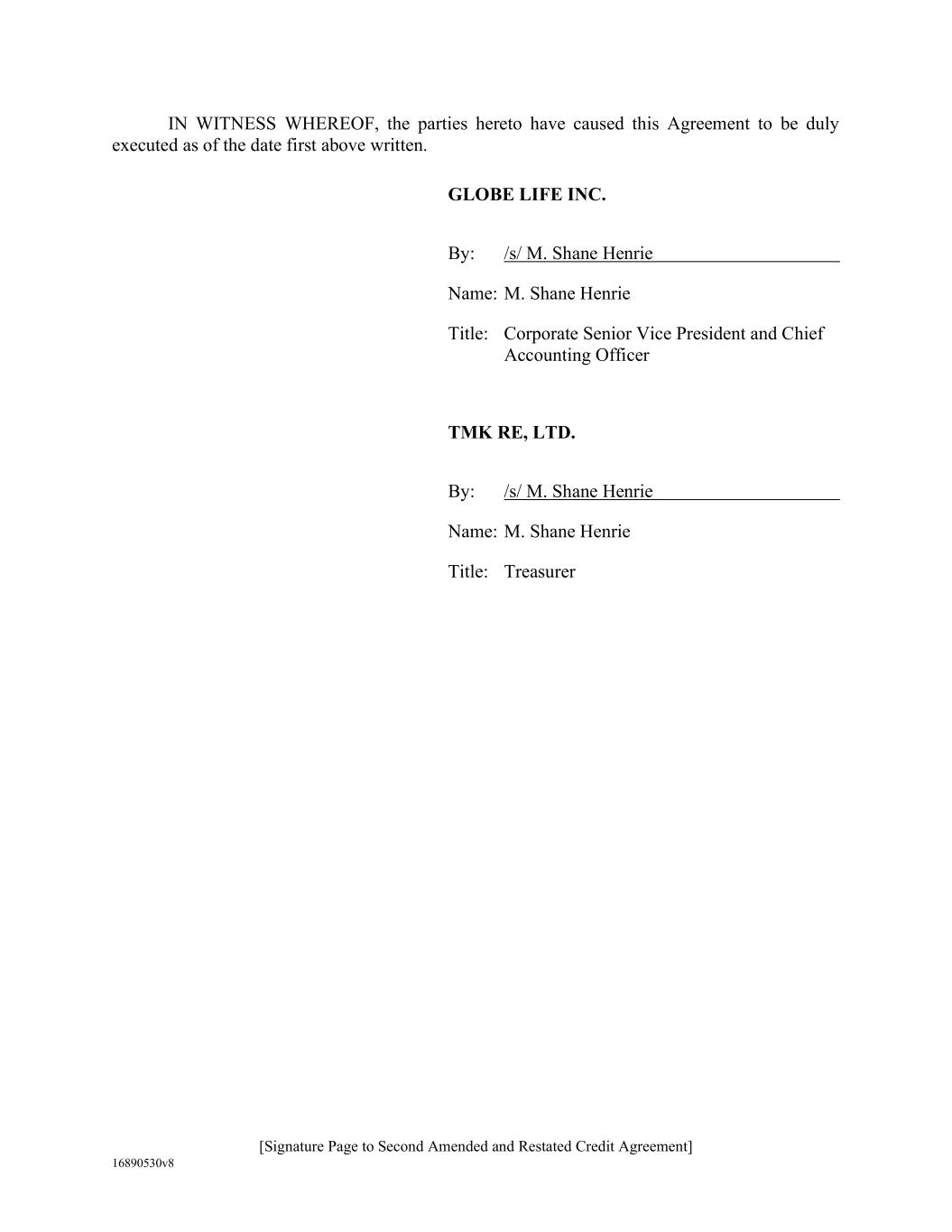 16890530v8 [Signature Page to Second Amended and Restated Credit Agreement] IN WITNESS WHEREOF, the parties hereto have caused this Agreement to be duly executed as of the date first above written. GLOBE LIFE INC. By: /s/ M. Shane Henrie Name: M. Shane Henrie Title: Corporate Senior Vice President and Chief Accounting Officer TMK RE, LTD. By: /s/ M. Shane Henrie Name: M. Shane Henrie Title: Treasurer