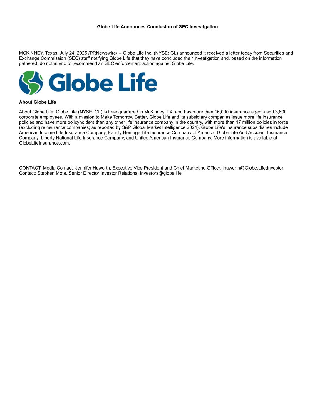 Globe Life Announces Conclusion of SEC Investigation MCKINNEY, Texas, July 24, 2025 /PRNewswire/ -- Globe Life Inc. (NYSE: GL) announced it received a letter today from Securities and Exchange Commission (SEC) staff notifying Globe Life that they have concluded their investigation and, based on the information gathered, do not intend to recommend an SEC enforcement action against Globe Life. About Globe Life About Globe Life: Globe Life (NYSE: GL) is headquartered in McKinney, TX, and has more than 16,000 insurance agents and 3,600 corporate employees. With a mission to Make Tomorrow Better, Globe Life and its subsidiary companies issue more life insurance policies and have more policyholders than any other life insurance company in the country, with more than 17 million policies in force (excluding reinsurance companies; as reported by S&P Global Market Intelligence 2024). Globe Life's insurance subsidiaries include American Income Life Insurance Company, Family Heritage Life Insurance Company of America, Globe Life And Accident Insurance Company, Liberty National Life Insurance Company, and United American Insurance Company. More information is available at GlobeLifeInsurance.com. CONTACT: Media Contact: Jennifer Haworth, Executive Vice President and Chief Marketing Officer, jhaworth@Globe.Life;Investor Contact: Stephen Mota, Senior Director Investor Relations, Investors@globe.life