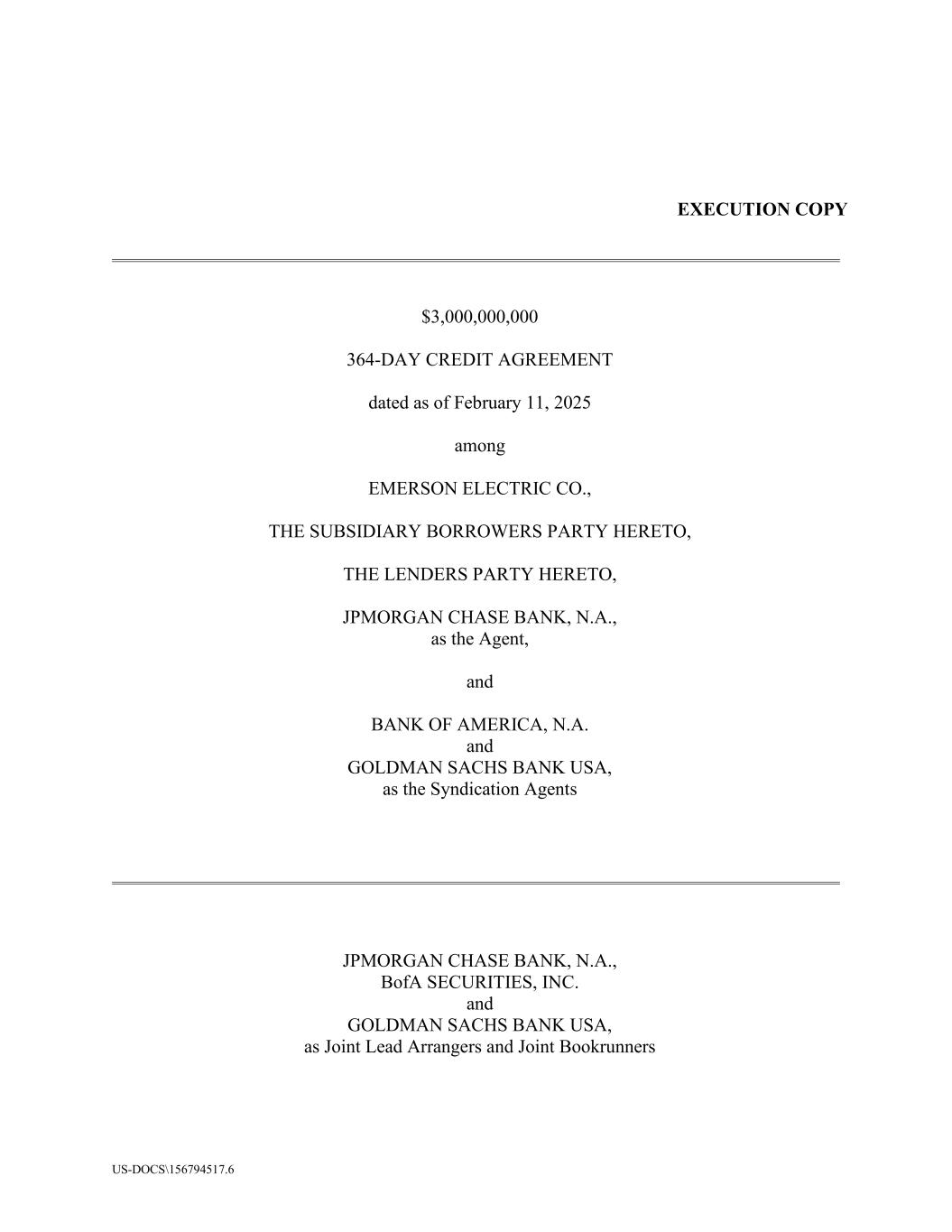 US-DOCS\156794517.6 EXECUTION COPY $3,000,000,000 364-DAY CREDIT AGREEMENT dated as of February 11, 2025 among EMERSON ELECTRIC CO., THE SUBSIDIARY BORROWERS PARTY HERETO, THE LENDERS PARTY HERETO, JPMORGAN CHASE BANK, N.A., as the Agent, and BANK OF AMERICA, N.A. and GOLDMAN SACHS BANK USA, as the Syndication Agents JPMORGAN CHASE BANK, N.A., BofA SECURITIES, INC. and GOLDMAN SACHS BANK USA, as Joint Lead Arrangers and Joint Bookrunners
