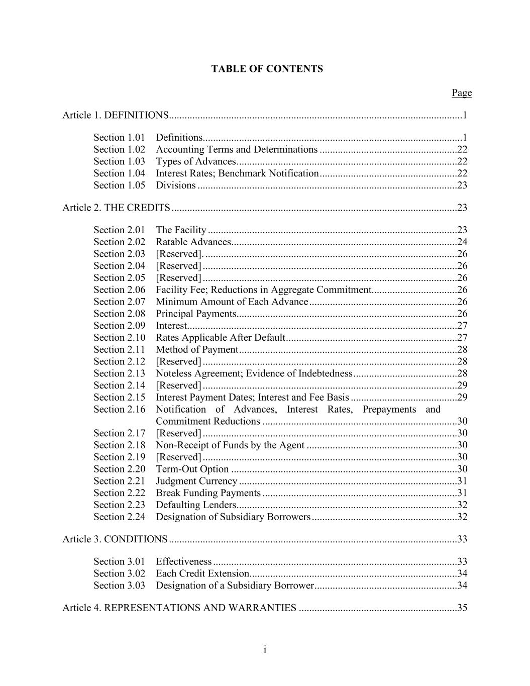 i TABLE OF CONTENTS Page Article 1. DEFINITIONS.................................................................................................................1 Section 1.01 Definitions....................................................................................................1 Section 1.02 Accounting Terms and Determinations .....................................................22 Section 1.03 Types of Advances .....................................................................................22 Section 1.04 Interest Rates; Benchmark Notification .....................................................22 Section 1.05 Divisions ....................................................................................................23 Article 2. THE CREDITS ..............................................................................................................23 Section 2.01 The Facility ................................................................................................23 Section 2.02 Ratable Advances.......................................................................................24 Section 2.03 [Reserved]. .................................................................................................26 Section 2.04 [Reserved] ..................................................................................................26 Section 2.05 [Reserved] ..................................................................................................26 Section 2.06 Facility Fee; Reductions in Aggregate Commitment.................................26 Section 2.07 Minimum Amount of Each Advance .........................................................26 Section 2.08 Principal Payments.....................................................................................26 Section 2.09 Interest........................................................................................................27 Section 2.10 Rates Applicable After Default ..................................................................27 Section 2.11 Method of Payment ....................................................................................28 Section 2.12 [Reserved] ..................................................................................................28 Section 2.13 Noteless Agreement; Evidence of Indebtedness ........................................28 Section 2.14 [Reserved] ..................................................................................................29 Section 2.15 Interest Payment Dates; Interest and Fee Basis .........................................29 Section 2.16 Notification of Advances, Interest Rates, Prepayments and Commitment Reductions ...........................................................................30 Section 2.17 [Reserved] ..................................................................................................30 Section 2.18 Non-Receipt of Funds by the Agent ..........................................................30 Section 2.19 [Reserved] ..................................................................................................30 Section 2.20 Term-Out Option .......................................................................................30 Section 2.21 Judgment Currency ....................................................................................31 Section 2.22 Break Funding Payments ...........................................................................31 Section 2.23 Defaulting Lenders.....................................................................................32 Section 2.24 Designation of Subsidiary Borrowers ........................................................32 Article 3. CONDITIONS ...............................................................................................................33 Section 3.01 Effectiveness ..............................................................................................33 Section 3.02 Each Credit Extension................................................................................34 Section 3.03 Designation of a Subsidiary Borrower .......................................................34 Article 4. REPRESENTATIONS AND WARRANTIES .............................................................35