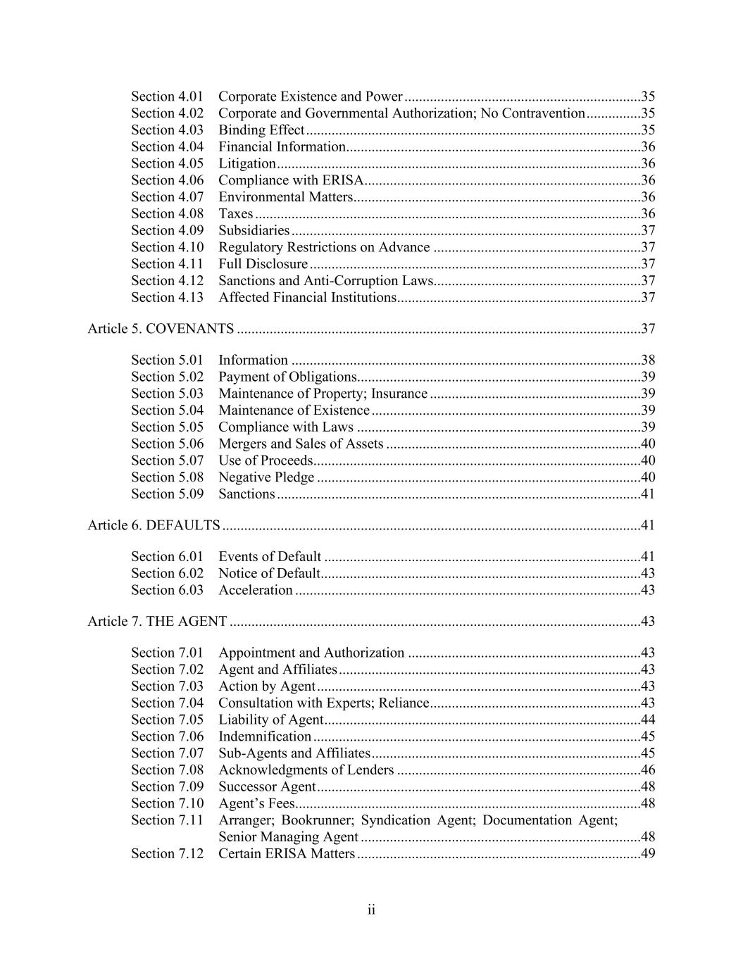 ii Section 4.01 Corporate Existence and Power .................................................................35 Section 4.02 Corporate and Governmental Authorization; No Contravention ...............35 Section 4.03 Binding Effect ............................................................................................35 Section 4.04 Financial Information.................................................................................36 Section 4.05 Litigation ....................................................................................................36 Section 4.06 Compliance with ERISA............................................................................36 Section 4.07 Environmental Matters...............................................................................36 Section 4.08 Taxes ..........................................................................................................36 Section 4.09 Subsidiaries ................................................................................................37 Section 4.10 Regulatory Restrictions on Advance .........................................................37 Section 4.11 Full Disclosure ...........................................................................................37 Section 4.12 Sanctions and Anti-Corruption Laws.........................................................37 Section 4.13 Affected Financial Institutions ...................................................................37 Article 5. COVENANTS ...............................................................................................................37 Section 5.01 Information ................................................................................................38 Section 5.02 Payment of Obligations..............................................................................39 Section 5.03 Maintenance of Property; Insurance ..........................................................39 Section 5.04 Maintenance of Existence ..........................................................................39 Section 5.05 Compliance with Laws ..............................................................................39 Section 5.06 Mergers and Sales of Assets ......................................................................40 Section 5.07 Use of Proceeds..........................................................................................40 Section 5.08 Negative Pledge .........................................................................................40 Section 5.09 Sanctions ....................................................................................................41 Article 6. DEFAULTS ...................................................................................................................41 Section 6.01 Events of Default .......................................................................................41 Section 6.02 Notice of Default........................................................................................43 Section 6.03 Acceleration ...............................................................................................43 Article 7. THE AGENT .................................................................................................................43 Section 7.01 Appointment and Authorization ................................................................43 Section 7.02 Agent and Affiliates ...................................................................................43 Section 7.03 Action by Agent .........................................................................................43 Section 7.04 Consultation with Experts; Reliance ..........................................................43 Section 7.05 Liability of Agent .......................................................................................44 Section 7.06 Indemnification ..........................................................................................45 Section 7.07 Sub-Agents and Affiliates ..........................................................................45 Section 7.08 Acknowledgments of Lenders ...................................................................46 Section 7.09 Successor Agent .........................................................................................48 Section 7.10 Agent’s Fees...............................................................................................48 Section 7.11 Arranger; Bookrunner; Syndication Agent; Documentation Agent; Senior Managing Agent .............................................................................48 Section 7.12 Certain ERISA Matters ..............................................................................49