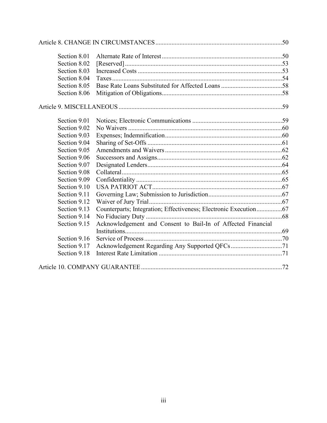 iii Article 8. CHANGE IN CIRCUMSTANCES ...............................................................................50 Section 8.01 Alternate Rate of Interest ...........................................................................50 Section 8.02 [Reserved] ..................................................................................................53 Section 8.03 Increased Costs ..........................................................................................53 Section 8.04 Taxes ..........................................................................................................54 Section 8.05 Base Rate Loans Substituted for Affected Loans ......................................58 Section 8.06 Mitigation of Obligations ...........................................................................58 Article 9. MISCELLANEOUS ......................................................................................................59 Section 9.01 Notices; Electronic Communications ........................................................59 Section 9.02 No Waivers ................................................................................................60 Section 9.03 Expenses; Indemnification .........................................................................60 Section 9.04 Sharing of Set-Offs ....................................................................................61 Section 9.05 Amendments and Waivers .........................................................................62 Section 9.06 Successors and Assigns..............................................................................62 Section 9.07 Designated Lenders ....................................................................................64 Section 9.08 Collateral ....................................................................................................65 Section 9.09 Confidentiality ...........................................................................................65 Section 9.10 USA PATRIOT ACT .................................................................................67 Section 9.11 Governing Law; Submission to Jurisdiction ..............................................67 Section 9.12 Waiver of Jury Trial ...................................................................................67 Section 9.13 Counterparts; Integration; Effectiveness; Electronic Execution ................67 Section 9.14 No Fiduciary Duty .....................................................................................68 Section 9.15 Acknowledgement and Consent to Bail-In of Affected Financial Institutions..................................................................................................69 Section 9.16 Service of Process ......................................................................................70 Section 9.17 Acknowledgement Regarding Any Supported QFCs ................................71 Section 9.18 Interest Rate Limitation .............................................................................71 Article 10. COMPANY GUARANTEE ........................................................................................72