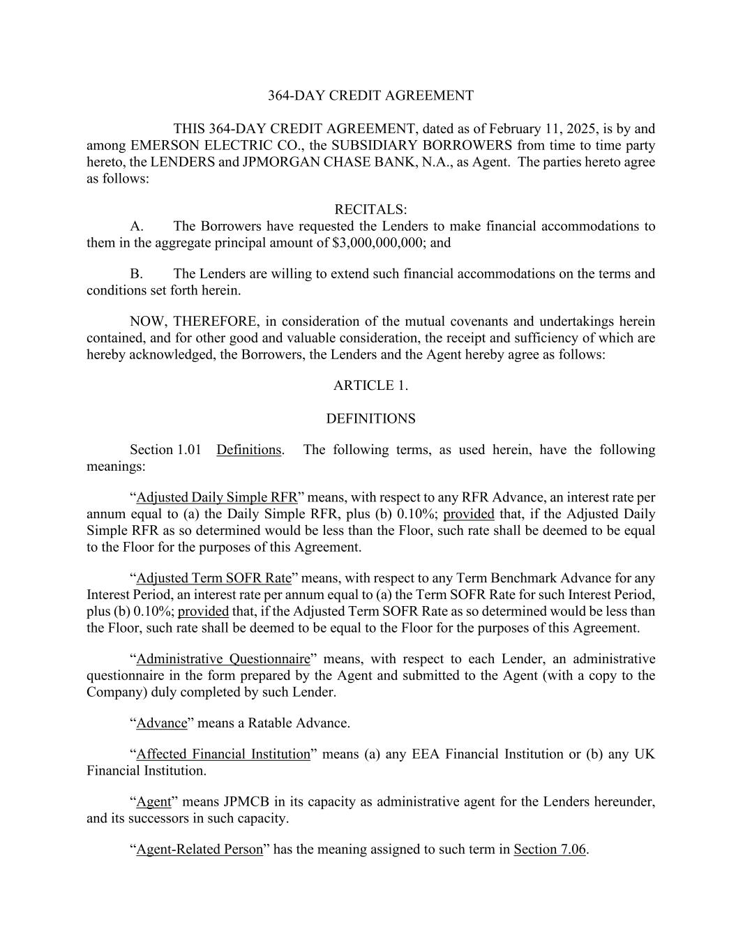 364-DAY CREDIT AGREEMENT THIS 364-DAY CREDIT AGREEMENT, dated as of February 11, 2025, is by and among EMERSON ELECTRIC CO., the SUBSIDIARY BORROWERS from time to time party hereto, the LENDERS and JPMORGAN CHASE BANK, N.A., as Agent. The parties hereto agree as follows: RECITALS: A. The Borrowers have requested the Lenders to make financial accommodations to them in the aggregate principal amount of $3,000,000,000; and B. The Lenders are willing to extend such financial accommodations on the terms and conditions set forth herein. NOW, THEREFORE, in consideration of the mutual covenants and undertakings herein contained, and for other good and valuable consideration, the receipt and sufficiency of which are hereby acknowledged, the Borrowers, the Lenders and the Agent hereby agree as follows: ARTICLE 1. DEFINITIONS Section 1.01 Definitions. The following terms, as used herein, have the following meanings: “Adjusted Daily Simple RFR” means, with respect to any RFR Advance, an interest rate per annum equal to (a) the Daily Simple RFR, plus (b) 0.10%; provided that, if the Adjusted Daily Simple RFR as so determined would be less than the Floor, such rate shall be deemed to be equal to the Floor for the purposes of this Agreement. “Adjusted Term SOFR Rate” means, with respect to any Term Benchmark Advance for any Interest Period, an interest rate per annum equal to (a) the Term SOFR Rate for such Interest Period, plus (b) 0.10%; provided that, if the Adjusted Term SOFR Rate as so determined would be less than the Floor, such rate shall be deemed to be equal to the Floor for the purposes of this Agreement. “Administrative Questionnaire” means, with respect to each Lender, an administrative questionnaire in the form prepared by the Agent and submitted to the Agent (with a copy to the Company) duly completed by such Lender. “Advance” means a Ratable Advance. “Affected Financial Institution” means (a) any EEA Financial Institution or (b) any UK Financial Institution. “Agent” means JPMCB in its capacity as administrative agent for the Lenders hereunder, and its successors in such capacity. “Agent-Related Person” has the meaning assigned to such term in Section 7.06.