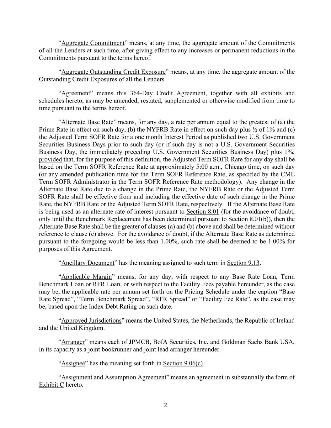 2 “Aggregate Commitment” means, at any time, the aggregate amount of the Commitments of all the Lenders at such time, after giving effect to any increases or permanent reductions in the Commitments pursuant to the terms hereof. “Aggregate Outstanding Credit Exposure” means, at any time, the aggregate amount of the Outstanding Credit Exposures of all the Lenders. “Agreement” means this 364-Day Credit Agreement, together with all exhibits and schedules hereto, as may be amended, restated, supplemented or otherwise modified from time to time pursuant to the terms hereof. “Alternate Base Rate” means, for any day, a rate per annum equal to the greatest of (a) the Prime Rate in effect on such day, (b) the NYFRB Rate in effect on such day plus ½ of 1% and (c) the Adjusted Term SOFR Rate for a one month Interest Period as published two U.S. Government Securities Business Days prior to such day (or if such day is not a U.S. Government Securities Business Day, the immediately preceding U.S. Government Securities Business Day) plus 1%; provided that, for the purpose of this definition, the Adjusted Term SOFR Rate for any day shall be based on the Term SOFR Reference Rate at approximately 5:00 a.m., Chicago time, on such day (or any amended publication time for the Term SOFR Reference Rate, as specified by the CME Term SOFR Administrator in the Term SOFR Reference Rate methodology). Any change in the Alternate Base Rate due to a change in the Prime Rate, the NYFRB Rate or the Adjusted Term SOFR Rate shall be effective from and including the effective date of such change in the Prime Rate, the NYFRB Rate or the Adjusted Term SOFR Rate, respectively. If the Alternate Base Rate is being used as an alternate rate of interest pursuant to Section 8.01 (for the avoidance of doubt, only until the Benchmark Replacement has been determined pursuant to Section 8.01(b)), then the Alternate Base Rate shall be the greater of clauses (a) and (b) above and shall be determined without reference to clause (c) above. For the avoidance of doubt, if the Alternate Base Rate as determined pursuant to the foregoing would be less than 1.00%, such rate shall be deemed to be 1.00% for purposes of this Agreement. “Ancillary Document” has the meaning assigned to such term in Section 9.13. “Applicable Margin” means, for any day, with respect to any Base Rate Loan, Term Benchmark Loan or RFR Loan, or with respect to the Facility Fees payable hereunder, as the case may be, the applicable rate per annum set forth on the Pricing Schedule under the caption “Base Rate Spread”, “Term Benchmark Spread”, “RFR Spread” or “Facility Fee Rate”, as the case may be, based upon the Index Debt Rating on such date. “Approved Jurisdictions” means the United States, the Netherlands, the Republic of Ireland and the United Kingdom. “Arranger” means each of JPMCB, BofA Securities, Inc. and Goldman Sachs Bank USA, in its capacity as a joint bookrunner and joint lead arranger hereunder. “Assignee” has the meaning set forth in Section 9.06(c). “Assignment and Assumption Agreement” means an agreement in substantially the form of Exhibit C hereto.