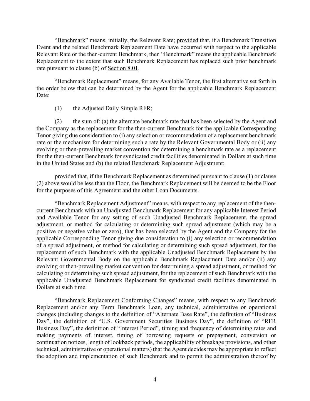 4 “Benchmark” means, initially, the Relevant Rate; provided that, if a Benchmark Transition Event and the related Benchmark Replacement Date have occurred with respect to the applicable Relevant Rate or the then-current Benchmark, then “Benchmark” means the applicable Benchmark Replacement to the extent that such Benchmark Replacement has replaced such prior benchmark rate pursuant to clause (b) of Section 8.01. “Benchmark Replacement” means, for any Available Tenor, the first alternative set forth in the order below that can be determined by the Agent for the applicable Benchmark Replacement Date: (1) the Adjusted Daily Simple RFR; (2) the sum of: (a) the alternate benchmark rate that has been selected by the Agent and the Company as the replacement for the then-current Benchmark for the applicable Corresponding Tenor giving due consideration to (i) any selection or recommendation of a replacement benchmark rate or the mechanism for determining such a rate by the Relevant Governmental Body or (ii) any evolving or then-prevailing market convention for determining a benchmark rate as a replacement for the then-current Benchmark for syndicated credit facilities denominated in Dollars at such time in the United States and (b) the related Benchmark Replacement Adjustment; provided that, if the Benchmark Replacement as determined pursuant to clause (1) or clause (2) above would be less than the Floor, the Benchmark Replacement will be deemed to be the Floor for the purposes of this Agreement and the other Loan Documents. “Benchmark Replacement Adjustment” means, with respect to any replacement of the then- current Benchmark with an Unadjusted Benchmark Replacement for any applicable Interest Period and Available Tenor for any setting of such Unadjusted Benchmark Replacement, the spread adjustment, or method for calculating or determining such spread adjustment (which may be a positive or negative value or zero), that has been selected by the Agent and the Company for the applicable Corresponding Tenor giving due consideration to (i) any selection or recommendation of a spread adjustment, or method for calculating or determining such spread adjustment, for the replacement of such Benchmark with the applicable Unadjusted Benchmark Replacement by the Relevant Governmental Body on the applicable Benchmark Replacement Date and/or (ii) any evolving or then-prevailing market convention for determining a spread adjustment, or method for calculating or determining such spread adjustment, for the replacement of such Benchmark with the applicable Unadjusted Benchmark Replacement for syndicated credit facilities denominated in Dollars at such time. “Benchmark Replacement Conforming Changes” means, with respect to any Benchmark Replacement and/or any Term Benchmark Loan, any technical, administrative or operational changes (including changes to the definition of “Alternate Base Rate”, the definition of “Business Day”, the definition of “U.S. Government Securities Business Day”, the definition of “RFR Business Day”, the definition of “Interest Period”, timing and frequency of determining rates and making payments of interest, timing of borrowing requests or prepayment, conversion or continuation notices, length of lookback periods, the applicability of breakage provisions, and other technical, administrative or operational matters) that the Agent decides may be appropriate to reflect the adoption and implementation of such Benchmark and to permit the administration thereof by