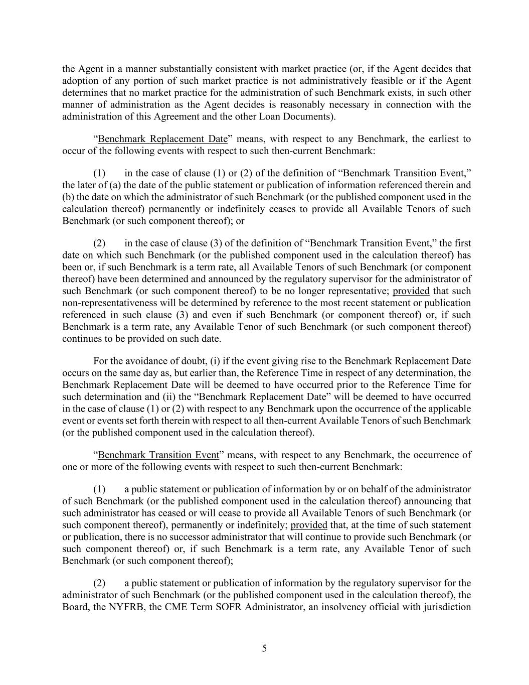 5 the Agent in a manner substantially consistent with market practice (or, if the Agent decides that adoption of any portion of such market practice is not administratively feasible or if the Agent determines that no market practice for the administration of such Benchmark exists, in such other manner of administration as the Agent decides is reasonably necessary in connection with the administration of this Agreement and the other Loan Documents). “Benchmark Replacement Date” means, with respect to any Benchmark, the earliest to occur of the following events with respect to such then-current Benchmark: (1) in the case of clause (1) or (2) of the definition of “Benchmark Transition Event,” the later of (a) the date of the public statement or publication of information referenced therein and (b) the date on which the administrator of such Benchmark (or the published component used in the calculation thereof) permanently or indefinitely ceases to provide all Available Tenors of such Benchmark (or such component thereof); or (2) in the case of clause (3) of the definition of “Benchmark Transition Event,” the first date on which such Benchmark (or the published component used in the calculation thereof) has been or, if such Benchmark is a term rate, all Available Tenors of such Benchmark (or component thereof) have been determined and announced by the regulatory supervisor for the administrator of such Benchmark (or such component thereof) to be no longer representative; provided that such non-representativeness will be determined by reference to the most recent statement or publication referenced in such clause (3) and even if such Benchmark (or component thereof) or, if such Benchmark is a term rate, any Available Tenor of such Benchmark (or such component thereof) continues to be provided on such date. For the avoidance of doubt, (i) if the event giving rise to the Benchmark Replacement Date occurs on the same day as, but earlier than, the Reference Time in respect of any determination, the Benchmark Replacement Date will be deemed to have occurred prior to the Reference Time for such determination and (ii) the “Benchmark Replacement Date” will be deemed to have occurred in the case of clause (1) or (2) with respect to any Benchmark upon the occurrence of the applicable event or events set forth therein with respect to all then-current Available Tenors of such Benchmark (or the published component used in the calculation thereof). “Benchmark Transition Event” means, with respect to any Benchmark, the occurrence of one or more of the following events with respect to such then-current Benchmark: (1) a public statement or publication of information by or on behalf of the administrator of such Benchmark (or the published component used in the calculation thereof) announcing that such administrator has ceased or will cease to provide all Available Tenors of such Benchmark (or such component thereof), permanently or indefinitely; provided that, at the time of such statement or publication, there is no successor administrator that will continue to provide such Benchmark (or such component thereof) or, if such Benchmark is a term rate, any Available Tenor of such Benchmark (or such component thereof); (2) a public statement or publication of information by the regulatory supervisor for the administrator of such Benchmark (or the published component used in the calculation thereof), the Board, the NYFRB, the CME Term SOFR Administrator, an insolvency official with jurisdiction
