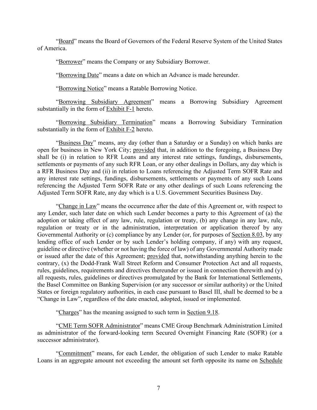 7 “Board” means the Board of Governors of the Federal Reserve System of the United States of America. “Borrower” means the Company or any Subsidiary Borrower. “Borrowing Date” means a date on which an Advance is made hereunder. “Borrowing Notice” means a Ratable Borrowing Notice. “Borrowing Subsidiary Agreement” means a Borrowing Subsidiary Agreement substantially in the form of Exhibit F-1 hereto. “Borrowing Subsidiary Termination” means a Borrowing Subsidiary Termination substantially in the form of Exhibit F-2 hereto. “Business Day” means, any day (other than a Saturday or a Sunday) on which banks are open for business in New York City; provided that, in addition to the foregoing, a Business Day shall be (i) in relation to RFR Loans and any interest rate settings, fundings, disbursements, settlements or payments of any such RFR Loan, or any other dealings in Dollars, any day which is a RFR Business Day and (ii) in relation to Loans referencing the Adjusted Term SOFR Rate and any interest rate settings, fundings, disbursements, settlements or payments of any such Loans referencing the Adjusted Term SOFR Rate or any other dealings of such Loans referencing the Adjusted Term SOFR Rate, any day which is a U.S. Government Securities Business Day. “Change in Law” means the occurrence after the date of this Agreement or, with respect to any Lender, such later date on which such Lender becomes a party to this Agreement of (a) the adoption or taking effect of any law, rule, regulation or treaty, (b) any change in any law, rule, regulation or treaty or in the administration, interpretation or application thereof by any Governmental Authority or (c) compliance by any Lender (or, for purposes of Section 8.03, by any lending office of such Lender or by such Lender’s holding company, if any) with any request, guideline or directive (whether or not having the force of law) of any Governmental Authority made or issued after the date of this Agreement; provided that, notwithstanding anything herein to the contrary, (x) the Dodd-Frank Wall Street Reform and Consumer Protection Act and all requests, rules, guidelines, requirements and directives thereunder or issued in connection therewith and (y) all requests, rules, guidelines or directives promulgated by the Bank for International Settlements, the Basel Committee on Banking Supervision (or any successor or similar authority) or the United States or foreign regulatory authorities, in each case pursuant to Basel III, shall be deemed to be a “Change in Law”, regardless of the date enacted, adopted, issued or implemented. “Charges” has the meaning assigned to such term in Section 9.18. “CME Term SOFR Administrator” means CME Group Benchmark Administration Limited as administrator of the forward-looking term Secured Overnight Financing Rate (SOFR) (or a successor administrator). “Commitment” means, for each Lender, the obligation of such Lender to make Ratable Loans in an aggregate amount not exceeding the amount set forth opposite its name on Schedule
