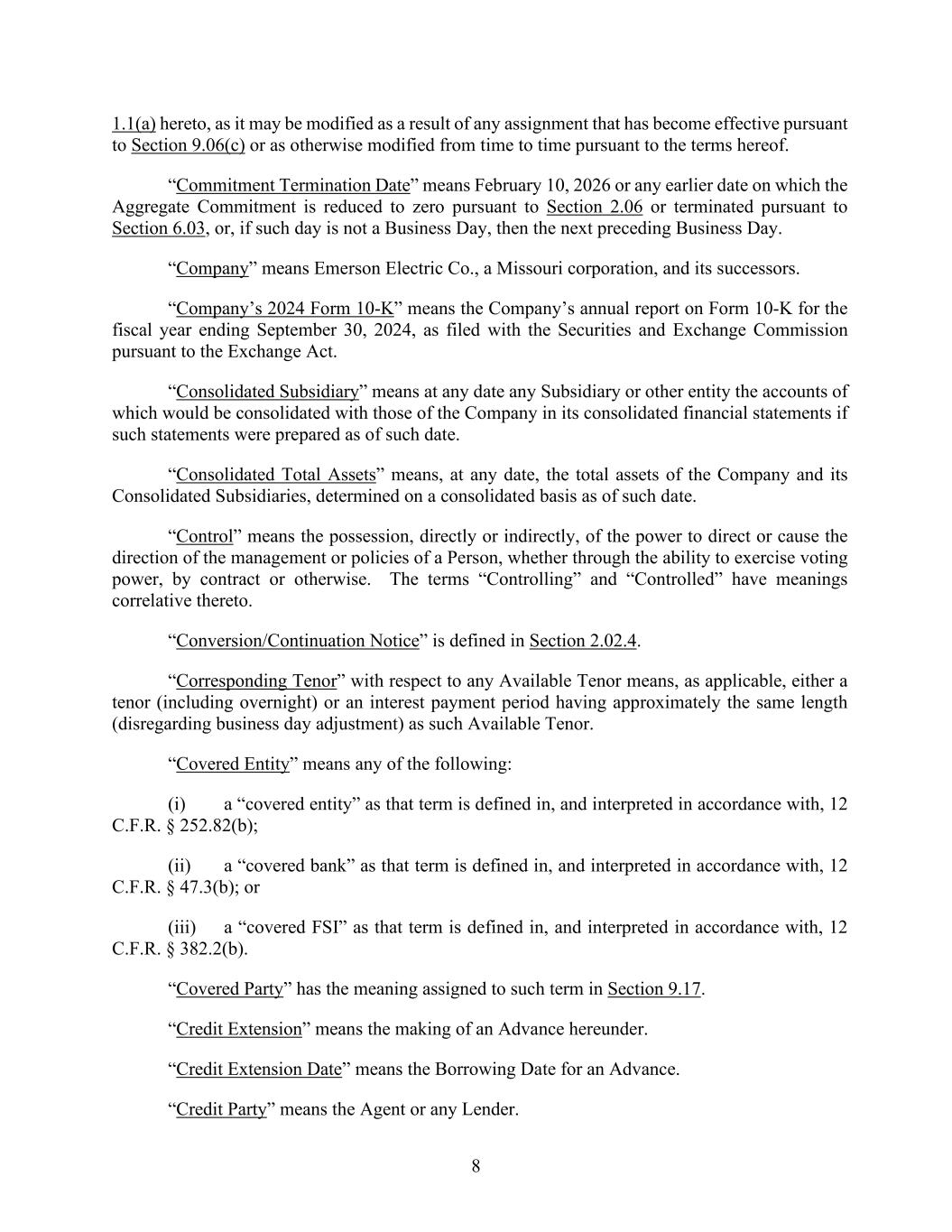 8 1.1(a) hereto, as it may be modified as a result of any assignment that has become effective pursuant to Section 9.06(c) or as otherwise modified from time to time pursuant to the terms hereof. “Commitment Termination Date” means February 10, 2026 or any earlier date on which the Aggregate Commitment is reduced to zero pursuant to Section 2.06 or terminated pursuant to Section 6.03, or, if such day is not a Business Day, then the next preceding Business Day. “Company” means Emerson Electric Co., a Missouri corporation, and its successors. “Company’s 2024 Form 10-K” means the Company’s annual report on Form 10-K for the fiscal year ending September 30, 2024, as filed with the Securities and Exchange Commission pursuant to the Exchange Act. “Consolidated Subsidiary” means at any date any Subsidiary or other entity the accounts of which would be consolidated with those of the Company in its consolidated financial statements if such statements were prepared as of such date. “Consolidated Total Assets” means, at any date, the total assets of the Company and its Consolidated Subsidiaries, determined on a consolidated basis as of such date. “Control” means the possession, directly or indirectly, of the power to direct or cause the direction of the management or policies of a Person, whether through the ability to exercise voting power, by contract or otherwise. The terms “Controlling” and “Controlled” have meanings correlative thereto. “Conversion/Continuation Notice” is defined in Section 2.02.4. “Corresponding Tenor” with respect to any Available Tenor means, as applicable, either a tenor (including overnight) or an interest payment period having approximately the same length (disregarding business day adjustment) as such Available Tenor. “Covered Entity” means any of the following: (i) a “covered entity” as that term is defined in, and interpreted in accordance with, 12 C.F.R. § 252.82(b); (ii) a “covered bank” as that term is defined in, and interpreted in accordance with, 12 C.F.R. § 47.3(b); or (iii) a “covered FSI” as that term is defined in, and interpreted in accordance with, 12 C.F.R. § 382.2(b). “Covered Party” has the meaning assigned to such term in Section 9.17. “Credit Extension” means the making of an Advance hereunder. “Credit Extension Date” means the Borrowing Date for an Advance. “Credit Party” means the Agent or any Lender.