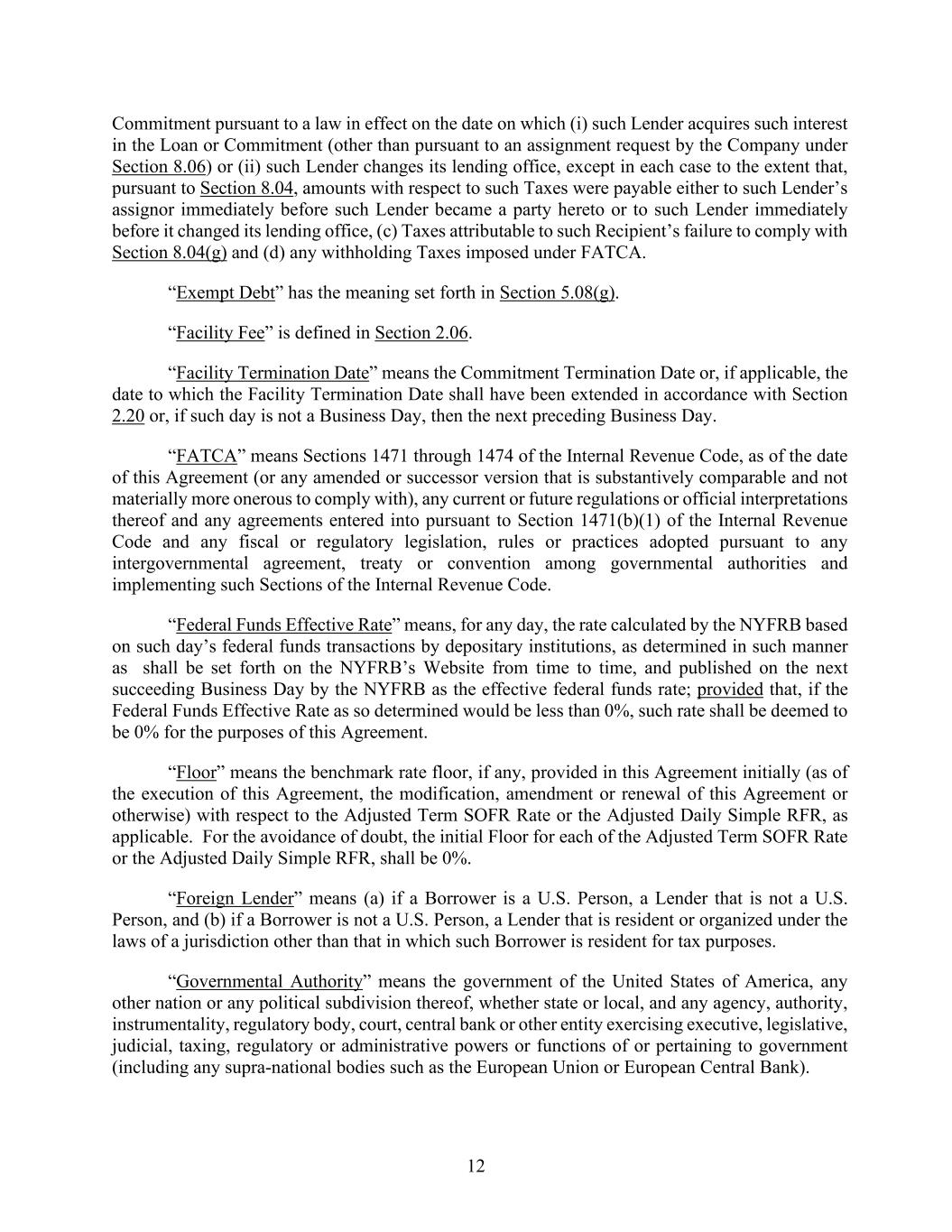 12 Commitment pursuant to a law in effect on the date on which (i) such Lender acquires such interest in the Loan or Commitment (other than pursuant to an assignment request by the Company under Section 8.06) or (ii) such Lender changes its lending office, except in each case to the extent that, pursuant to Section 8.04, amounts with respect to such Taxes were payable either to such Lender’s assignor immediately before such Lender became a party hereto or to such Lender immediately before it changed its lending office, (c) Taxes attributable to such Recipient’s failure to comply with Section 8.04(g) and (d) any withholding Taxes imposed under FATCA. “Exempt Debt” has the meaning set forth in Section 5.08(g). “Facility Fee” is defined in Section 2.06. “Facility Termination Date” means the Commitment Termination Date or, if applicable, the date to which the Facility Termination Date shall have been extended in accordance with Section 2.20 or, if such day is not a Business Day, then the next preceding Business Day. “FATCA” means Sections 1471 through 1474 of the Internal Revenue Code, as of the date of this Agreement (or any amended or successor version that is substantively comparable and not materially more onerous to comply with), any current or future regulations or official interpretations thereof and any agreements entered into pursuant to Section 1471(b)(1) of the Internal Revenue Code and any fiscal or regulatory legislation, rules or practices adopted pursuant to any intergovernmental agreement, treaty or convention among governmental authorities and implementing such Sections of the Internal Revenue Code. “Federal Funds Effective Rate” means, for any day, the rate calculated by the NYFRB based on such day’s federal funds transactions by depositary institutions, as determined in such manner as shall be set forth on the NYFRB’s Website from time to time, and published on the next succeeding Business Day by the NYFRB as the effective federal funds rate; provided that, if the Federal Funds Effective Rate as so determined would be less than 0%, such rate shall be deemed to be 0% for the purposes of this Agreement. “Floor” means the benchmark rate floor, if any, provided in this Agreement initially (as of the execution of this Agreement, the modification, amendment or renewal of this Agreement or otherwise) with respect to the Adjusted Term SOFR Rate or the Adjusted Daily Simple RFR, as applicable. For the avoidance of doubt, the initial Floor for each of the Adjusted Term SOFR Rate or the Adjusted Daily Simple RFR, shall be 0%. “Foreign Lender” means (a) if a Borrower is a U.S. Person, a Lender that is not a U.S. Person, and (b) if a Borrower is not a U.S. Person, a Lender that is resident or organized under the laws of a jurisdiction other than that in which such Borrower is resident for tax purposes. “Governmental Authority” means the government of the United States of America, any other nation or any political subdivision thereof, whether state or local, and any agency, authority, instrumentality, regulatory body, court, central bank or other entity exercising executive, legislative, judicial, taxing, regulatory or administrative powers or functions of or pertaining to government (including any supra-national bodies such as the European Union or European Central Bank).