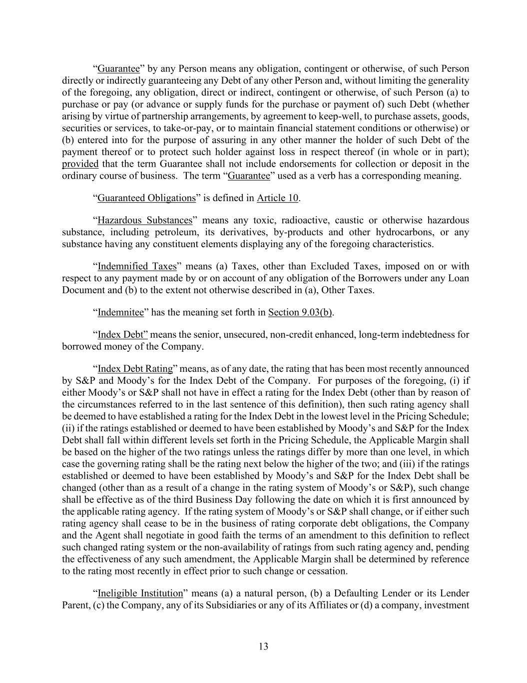 13 “Guarantee” by any Person means any obligation, contingent or otherwise, of such Person directly or indirectly guaranteeing any Debt of any other Person and, without limiting the generality of the foregoing, any obligation, direct or indirect, contingent or otherwise, of such Person (a) to purchase or pay (or advance or supply funds for the purchase or payment of) such Debt (whether arising by virtue of partnership arrangements, by agreement to keep-well, to purchase assets, goods, securities or services, to take-or-pay, or to maintain financial statement conditions or otherwise) or (b) entered into for the purpose of assuring in any other manner the holder of such Debt of the payment thereof or to protect such holder against loss in respect thereof (in whole or in part); provided that the term Guarantee shall not include endorsements for collection or deposit in the ordinary course of business. The term “Guarantee” used as a verb has a corresponding meaning. “Guaranteed Obligations” is defined in Article 10. “Hazardous Substances” means any toxic, radioactive, caustic or otherwise hazardous substance, including petroleum, its derivatives, by-products and other hydrocarbons, or any substance having any constituent elements displaying any of the foregoing characteristics. “Indemnified Taxes” means (a) Taxes, other than Excluded Taxes, imposed on or with respect to any payment made by or on account of any obligation of the Borrowers under any Loan Document and (b) to the extent not otherwise described in (a), Other Taxes. “Indemnitee” has the meaning set forth in Section 9.03(b). “Index Debt” means the senior, unsecured, non-credit enhanced, long-term indebtedness for borrowed money of the Company. “Index Debt Rating” means, as of any date, the rating that has been most recently announced by S&P and Moody’s for the Index Debt of the Company. For purposes of the foregoing, (i) if either Moody’s or S&P shall not have in effect a rating for the Index Debt (other than by reason of the circumstances referred to in the last sentence of this definition), then such rating agency shall be deemed to have established a rating for the Index Debt in the lowest level in the Pricing Schedule; (ii) if the ratings established or deemed to have been established by Moody’s and S&P for the Index Debt shall fall within different levels set forth in the Pricing Schedule, the Applicable Margin shall be based on the higher of the two ratings unless the ratings differ by more than one level, in which case the governing rating shall be the rating next below the higher of the two; and (iii) if the ratings established or deemed to have been established by Moody’s and S&P for the Index Debt shall be changed (other than as a result of a change in the rating system of Moody’s or S&P), such change shall be effective as of the third Business Day following the date on which it is first announced by the applicable rating agency. If the rating system of Moody’s or S&P shall change, or if either such rating agency shall cease to be in the business of rating corporate debt obligations, the Company and the Agent shall negotiate in good faith the terms of an amendment to this definition to reflect such changed rating system or the non-availability of ratings from such rating agency and, pending the effectiveness of any such amendment, the Applicable Margin shall be determined by reference to the rating most recently in effect prior to such change or cessation. “Ineligible Institution” means (a) a natural person, (b) a Defaulting Lender or its Lender Parent, (c) the Company, any of its Subsidiaries or any of its Affiliates or (d) a company, investment