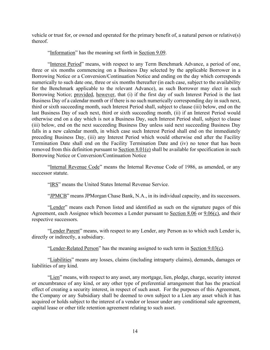 14 vehicle or trust for, or owned and operated for the primary benefit of, a natural person or relative(s) thereof. “Information” has the meaning set forth in Section 9.09. “Interest Period” means, with respect to any Term Benchmark Advance, a period of one, three or six months commencing on a Business Day selected by the applicable Borrower in a Borrowing Notice or a Conversion/Continuation Notice and ending on the day which corresponds numerically to such date one, three or six months thereafter (in each case, subject to the availability for the Benchmark applicable to the relevant Advance), as such Borrower may elect in such Borrowing Notice; provided, however, that (i) if the first day of such Interest Period is the last Business Day of a calendar month or if there is no such numerically corresponding day in such next, third or sixth succeeding month, such Interest Period shall, subject to clause (iii) below, end on the last Business Day of such next, third or sixth succeeding month, (ii) if an Interest Period would otherwise end on a day which is not a Business Day, such Interest Period shall, subject to clause (iii) below, end on the next succeeding Business Day unless said next succeeding Business Day falls in a new calendar month, in which case such Interest Period shall end on the immediately preceding Business Day, (iii) any Interest Period which would otherwise end after the Facility Termination Date shall end on the Facility Termination Date and (iv) no tenor that has been removed from this definition pursuant to Section 8.01(e) shall be available for specification in such Borrowing Notice or Conversion/Continuation Notice “Internal Revenue Code” means the Internal Revenue Code of 1986, as amended, or any successor statute. “IRS” means the United States Internal Revenue Service. “JPMCB” means JPMorgan Chase Bank, N.A., in its individual capacity, and its successors. “Lender” means each Person listed and identified as such on the signature pages of this Agreement, each Assignee which becomes a Lender pursuant to Section 8.06 or 9.06(c), and their respective successors. “Lender Parent” means, with respect to any Lender, any Person as to which such Lender is, directly or indirectly, a subsidiary. “Lender-Related Person” has the meaning assigned to such term in Section 9.03(c). “Liabilities” means any losses, claims (including intraparty claims), demands, damages or liabilities of any kind. “Lien” means, with respect to any asset, any mortgage, lien, pledge, charge, security interest or encumbrance of any kind, or any other type of preferential arrangement that has the practical effect of creating a security interest, in respect of such asset. For the purposes of this Agreement, the Company or any Subsidiary shall be deemed to own subject to a Lien any asset which it has acquired or holds subject to the interest of a vendor or lessor under any conditional sale agreement, capital lease or other title retention agreement relating to such asset.