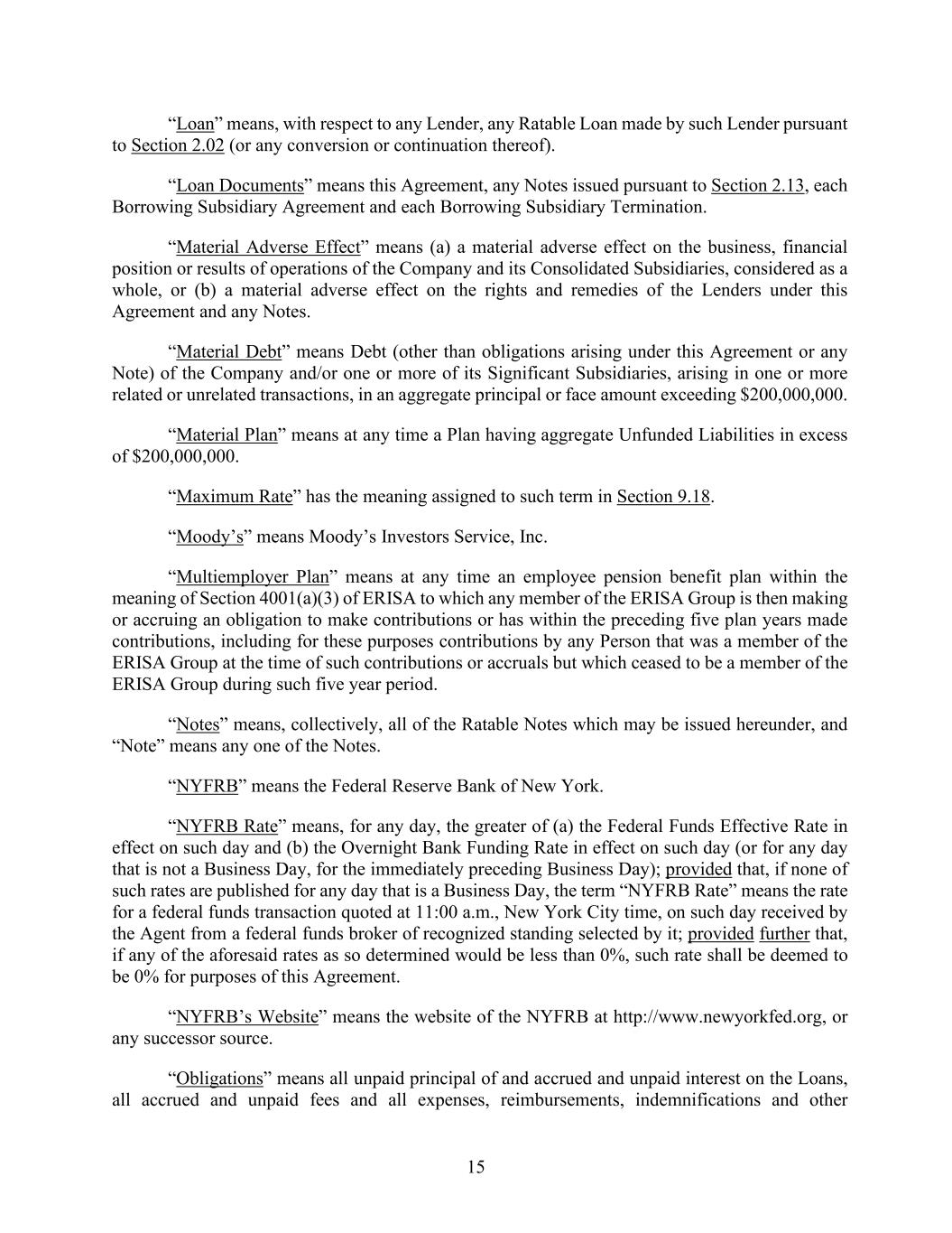 15 “Loan” means, with respect to any Lender, any Ratable Loan made by such Lender pursuant to Section 2.02 (or any conversion or continuation thereof). “Loan Documents” means this Agreement, any Notes issued pursuant to Section 2.13, each Borrowing Subsidiary Agreement and each Borrowing Subsidiary Termination. “Material Adverse Effect” means (a) a material adverse effect on the business, financial position or results of operations of the Company and its Consolidated Subsidiaries, considered as a whole, or (b) a material adverse effect on the rights and remedies of the Lenders under this Agreement and any Notes. “Material Debt” means Debt (other than obligations arising under this Agreement or any Note) of the Company and/or one or more of its Significant Subsidiaries, arising in one or more related or unrelated transactions, in an aggregate principal or face amount exceeding $200,000,000. “Material Plan” means at any time a Plan having aggregate Unfunded Liabilities in excess of $200,000,000. “Maximum Rate” has the meaning assigned to such term in Section 9.18. “Moody’s” means Moody’s Investors Service, Inc. “Multiemployer Plan” means at any time an employee pension benefit plan within the meaning of Section 4001(a)(3) of ERISA to which any member of the ERISA Group is then making or accruing an obligation to make contributions or has within the preceding five plan years made contributions, including for these purposes contributions by any Person that was a member of the ERISA Group at the time of such contributions or accruals but which ceased to be a member of the ERISA Group during such five year period. “Notes” means, collectively, all of the Ratable Notes which may be issued hereunder, and “Note” means any one of the Notes. “NYFRB” means the Federal Reserve Bank of New York. “NYFRB Rate” means, for any day, the greater of (a) the Federal Funds Effective Rate in effect on such day and (b) the Overnight Bank Funding Rate in effect on such day (or for any day that is not a Business Day, for the immediately preceding Business Day); provided that, if none of such rates are published for any day that is a Business Day, the term “NYFRB Rate” means the rate for a federal funds transaction quoted at 11:00 a.m., New York City time, on such day received by the Agent from a federal funds broker of recognized standing selected by it; provided further that, if any of the aforesaid rates as so determined would be less than 0%, such rate shall be deemed to be 0% for purposes of this Agreement. “NYFRB’s Website” means the website of the NYFRB at http://www.newyorkfed.org, or any successor source. “Obligations” means all unpaid principal of and accrued and unpaid interest on the Loans, all accrued and unpaid fees and all expenses, reimbursements, indemnifications and other