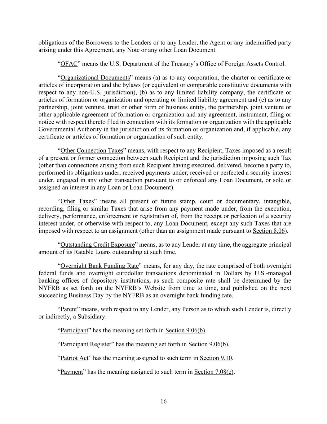16 obligations of the Borrowers to the Lenders or to any Lender, the Agent or any indemnified party arising under this Agreement, any Note or any other Loan Document. “OFAC” means the U.S. Department of the Treasury’s Office of Foreign Assets Control. “Organizational Documents” means (a) as to any corporation, the charter or certificate or articles of incorporation and the bylaws (or equivalent or comparable constitutive documents with respect to any non-U.S. jurisdiction), (b) as to any limited liability company, the certificate or articles of formation or organization and operating or limited liability agreement and (c) as to any partnership, joint venture, trust or other form of business entity, the partnership, joint venture or other applicable agreement of formation or organization and any agreement, instrument, filing or notice with respect thereto filed in connection with its formation or organization with the applicable Governmental Authority in the jurisdiction of its formation or organization and, if applicable, any certificate or articles of formation or organization of such entity. “Other Connection Taxes” means, with respect to any Recipient, Taxes imposed as a result of a present or former connection between such Recipient and the jurisdiction imposing such Tax (other than connections arising from such Recipient having executed, delivered, become a party to, performed its obligations under, received payments under, received or perfected a security interest under, engaged in any other transaction pursuant to or enforced any Loan Document, or sold or assigned an interest in any Loan or Loan Document). “Other Taxes” means all present or future stamp, court or documentary, intangible, recording, filing or similar Taxes that arise from any payment made under, from the execution, delivery, performance, enforcement or registration of, from the receipt or perfection of a security interest under, or otherwise with respect to, any Loan Document, except any such Taxes that are imposed with respect to an assignment (other than an assignment made pursuant to Section 8.06). “Outstanding Credit Exposure” means, as to any Lender at any time, the aggregate principal amount of its Ratable Loans outstanding at such time. “Overnight Bank Funding Rate” means, for any day, the rate comprised of both overnight federal funds and overnight eurodollar transactions denominated in Dollars by U.S.-managed banking offices of depository institutions, as such composite rate shall be determined by the NYFRB as set forth on the NYFRB’s Website from time to time, and published on the next succeeding Business Day by the NYFRB as an overnight bank funding rate. “Parent” means, with respect to any Lender, any Person as to which such Lender is, directly or indirectly, a Subsidiary. “Participant” has the meaning set forth in Section 9.06(b). “Participant Register” has the meaning set forth in Section 9.06(b). “Patriot Act” has the meaning assigned to such term in Section 9.10. “Payment” has the meaning assigned to such term in Section 7.08(c).
