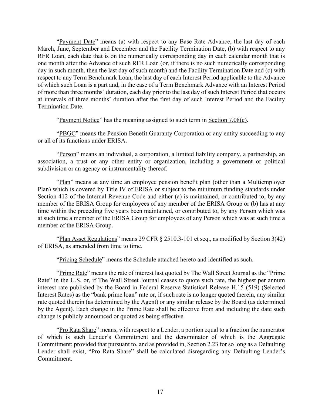 17 “Payment Date” means (a) with respect to any Base Rate Advance, the last day of each March, June, September and December and the Facility Termination Date, (b) with respect to any RFR Loan, each date that is on the numerically corresponding day in each calendar month that is one month after the Advance of such RFR Loan (or, if there is no such numerically corresponding day in such month, then the last day of such month) and the Facility Termination Date and (c) with respect to any Term Benchmark Loan, the last day of each Interest Period applicable to the Advance of which such Loan is a part and, in the case of a Term Benchmark Advance with an Interest Period of more than three months’ duration, each day prior to the last day of such Interest Period that occurs at intervals of three months’ duration after the first day of such Interest Period and the Facility Termination Date. “Payment Notice” has the meaning assigned to such term in Section 7.08(c). “PBGC” means the Pension Benefit Guaranty Corporation or any entity succeeding to any or all of its functions under ERISA. “Person” means an individual, a corporation, a limited liability company, a partnership, an association, a trust or any other entity or organization, including a government or political subdivision or an agency or instrumentality thereof. “Plan” means at any time an employee pension benefit plan (other than a Multiemployer Plan) which is covered by Title IV of ERISA or subject to the minimum funding standards under Section 412 of the Internal Revenue Code and either (a) is maintained, or contributed to, by any member of the ERISA Group for employees of any member of the ERISA Group or (b) has at any time within the preceding five years been maintained, or contributed to, by any Person which was at such time a member of the ERISA Group for employees of any Person which was at such time a member of the ERISA Group. “Plan Asset Regulations” means 29 CFR § 2510.3-101 et seq., as modified by Section 3(42) of ERISA, as amended from time to time. “Pricing Schedule” means the Schedule attached hereto and identified as such. “Prime Rate” means the rate of interest last quoted by The Wall Street Journal as the “Prime Rate” in the U.S. or, if The Wall Street Journal ceases to quote such rate, the highest per annum interest rate published by the Board in Federal Reserve Statistical Release H.15 (519) (Selected Interest Rates) as the “bank prime loan” rate or, if such rate is no longer quoted therein, any similar rate quoted therein (as determined by the Agent) or any similar release by the Board (as determined by the Agent). Each change in the Prime Rate shall be effective from and including the date such change is publicly announced or quoted as being effective. “Pro Rata Share” means, with respect to a Lender, a portion equal to a fraction the numerator of which is such Lender’s Commitment and the denominator of which is the Aggregate Commitment; provided that pursuant to, and as provided in, Section 2.23 for so long as a Defaulting Lender shall exist, “Pro Rata Share” shall be calculated disregarding any Defaulting Lender’s Commitment.