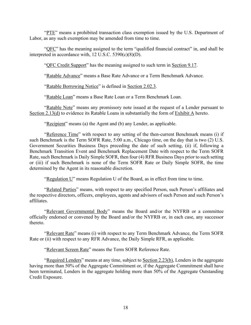 18 “PTE” means a prohibited transaction class exemption issued by the U.S. Department of Labor, as any such exemption may be amended from time to time. “QFC” has the meaning assigned to the term “qualified financial contract” in, and shall be interpreted in accordance with, 12 U.S.C. 5390(c)(8)(D). “QFC Credit Support” has the meaning assigned to such term in Section 9.17. “Ratable Advance” means a Base Rate Advance or a Term Benchmark Advance. “Ratable Borrowing Notice” is defined in Section 2.02.3. “Ratable Loan” means a Base Rate Loan or a Term Benchmark Loan. “Ratable Note” means any promissory note issued at the request of a Lender pursuant to Section 2.13(d) to evidence its Ratable Loans in substantially the form of Exhibit A hereto. “Recipient” means (a) the Agent and (b) any Lender, as applicable. “Reference Time” with respect to any setting of the then-current Benchmark means (i) if such Benchmark is the Term SOFR Rate, 5:00 a.m., Chicago time, on the day that is two (2) U.S. Government Securities Business Days preceding the date of such setting, (ii) if, following a Benchmark Transition Event and Benchmark Replacement Date with respect to the Term SOFR Rate, such Benchmark is Daily Simple SOFR, then four (4) RFR Business Days prior to such setting or (iii) if such Benchmark is none of the Term SOFR Rate or Daily Simple SOFR, the time determined by the Agent in its reasonable discretion. “Regulation U” means Regulation U of the Board, as in effect from time to time. “Related Parties” means, with respect to any specified Person, such Person’s affiliates and the respective directors, officers, employees, agents and advisors of such Person and such Person’s affiliates. “Relevant Governmental Body” means the Board and/or the NYFRB or a committee officially endorsed or convened by the Board and/or the NYFRB or, in each case, any successor thereto. “Relevant Rate” means (i) with respect to any Term Benchmark Advance, the Term SOFR Rate or (ii) with respect to any RFR Advance, the Daily Simple RFR, as applicable. “Relevant Screen Rate” means the Term SOFR Reference Rate. “Required Lenders” means at any time, subject to Section 2.23(b), Lenders in the aggregate having more than 50% of the Aggregate Commitment or, if the Aggregate Commitment shall have been terminated, Lenders in the aggregate holding more than 50% of the Aggregate Outstanding Credit Exposure.