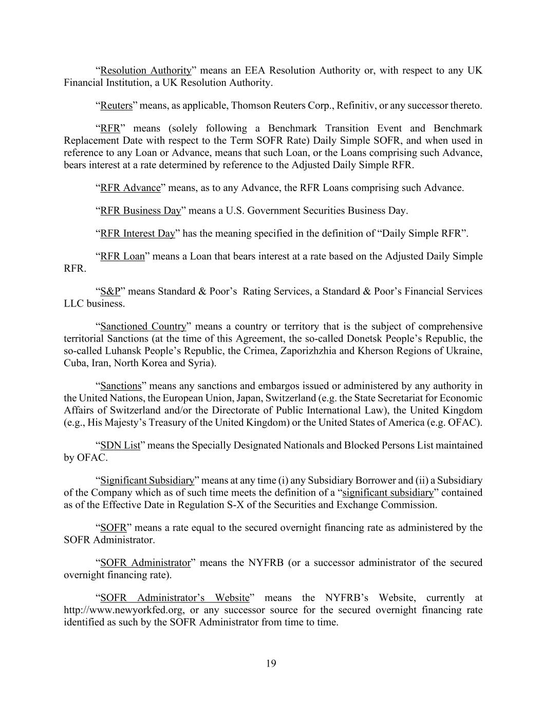 19 “Resolution Authority” means an EEA Resolution Authority or, with respect to any UK Financial Institution, a UK Resolution Authority. “Reuters” means, as applicable, Thomson Reuters Corp., Refinitiv, or any successor thereto. “RFR” means (solely following a Benchmark Transition Event and Benchmark Replacement Date with respect to the Term SOFR Rate) Daily Simple SOFR, and when used in reference to any Loan or Advance, means that such Loan, or the Loans comprising such Advance, bears interest at a rate determined by reference to the Adjusted Daily Simple RFR. “RFR Advance” means, as to any Advance, the RFR Loans comprising such Advance. “RFR Business Day” means a U.S. Government Securities Business Day. “RFR Interest Day” has the meaning specified in the definition of “Daily Simple RFR”. “RFR Loan” means a Loan that bears interest at a rate based on the Adjusted Daily Simple RFR. “S&P” means Standard & Poor’s Rating Services, a Standard & Poor’s Financial Services LLC business. “Sanctioned Country” means a country or territory that is the subject of comprehensive territorial Sanctions (at the time of this Agreement, the so-called Donetsk People’s Republic, the so-called Luhansk People’s Republic, the Crimea, Zaporizhzhia and Kherson Regions of Ukraine, Cuba, Iran, North Korea and Syria). “Sanctions” means any sanctions and embargos issued or administered by any authority in the United Nations, the European Union, Japan, Switzerland (e.g. the State Secretariat for Economic Affairs of Switzerland and/or the Directorate of Public International Law), the United Kingdom (e.g., His Majesty’s Treasury of the United Kingdom) or the United States of America (e.g. OFAC). “SDN List” means the Specially Designated Nationals and Blocked Persons List maintained by OFAC. “Significant Subsidiary” means at any time (i) any Subsidiary Borrower and (ii) a Subsidiary of the Company which as of such time meets the definition of a “significant subsidiary” contained as of the Effective Date in Regulation S-X of the Securities and Exchange Commission. “SOFR” means a rate equal to the secured overnight financing rate as administered by the SOFR Administrator. “SOFR Administrator” means the NYFRB (or a successor administrator of the secured overnight financing rate). “SOFR Administrator’s Website” means the NYFRB’s Website, currently at http://www.newyorkfed.org, or any successor source for the secured overnight financing rate identified as such by the SOFR Administrator from time to time.
