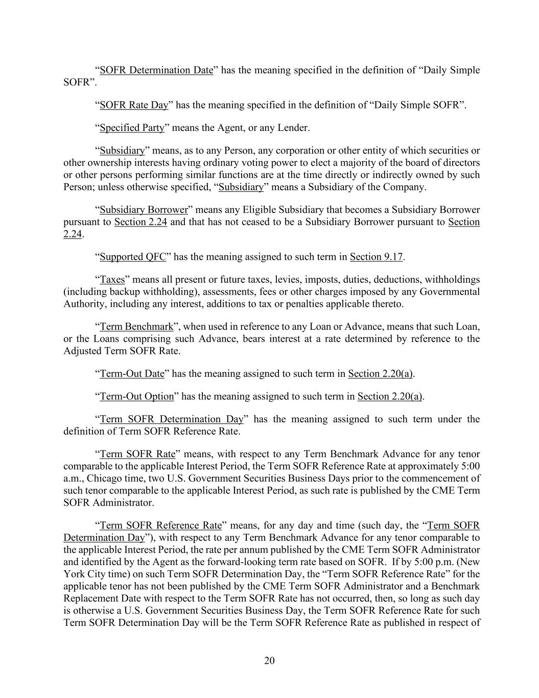 20 “SOFR Determination Date” has the meaning specified in the definition of “Daily Simple SOFR”. “SOFR Rate Day” has the meaning specified in the definition of “Daily Simple SOFR”. “Specified Party” means the Agent, or any Lender. “Subsidiary” means, as to any Person, any corporation or other entity of which securities or other ownership interests having ordinary voting power to elect a majority of the board of directors or other persons performing similar functions are at the time directly or indirectly owned by such Person; unless otherwise specified, “Subsidiary” means a Subsidiary of the Company. “Subsidiary Borrower” means any Eligible Subsidiary that becomes a Subsidiary Borrower pursuant to Section 2.24 and that has not ceased to be a Subsidiary Borrower pursuant to Section 2.24. “Supported QFC” has the meaning assigned to such term in Section 9.17. “Taxes” means all present or future taxes, levies, imposts, duties, deductions, withholdings (including backup withholding), assessments, fees or other charges imposed by any Governmental Authority, including any interest, additions to tax or penalties applicable thereto. “Term Benchmark”, when used in reference to any Loan or Advance, means that such Loan, or the Loans comprising such Advance, bears interest at a rate determined by reference to the Adjusted Term SOFR Rate. “Term-Out Date” has the meaning assigned to such term in Section 2.20(a). “Term-Out Option” has the meaning assigned to such term in Section 2.20(a). “Term SOFR Determination Day” has the meaning assigned to such term under the definition of Term SOFR Reference Rate. “Term SOFR Rate” means, with respect to any Term Benchmark Advance for any tenor comparable to the applicable Interest Period, the Term SOFR Reference Rate at approximately 5:00 a.m., Chicago time, two U.S. Government Securities Business Days prior to the commencement of such tenor comparable to the applicable Interest Period, as such rate is published by the CME Term SOFR Administrator. “Term SOFR Reference Rate” means, for any day and time (such day, the “Term SOFR Determination Day”), with respect to any Term Benchmark Advance for any tenor comparable to the applicable Interest Period, the rate per annum published by the CME Term SOFR Administrator and identified by the Agent as the forward-looking term rate based on SOFR. If by 5:00 p.m. (New York City time) on such Term SOFR Determination Day, the “Term SOFR Reference Rate” for the applicable tenor has not been published by the CME Term SOFR Administrator and a Benchmark Replacement Date with respect to the Term SOFR Rate has not occurred, then, so long as such day is otherwise a U.S. Government Securities Business Day, the Term SOFR Reference Rate for such Term SOFR Determination Day will be the Term SOFR Reference Rate as published in respect of
