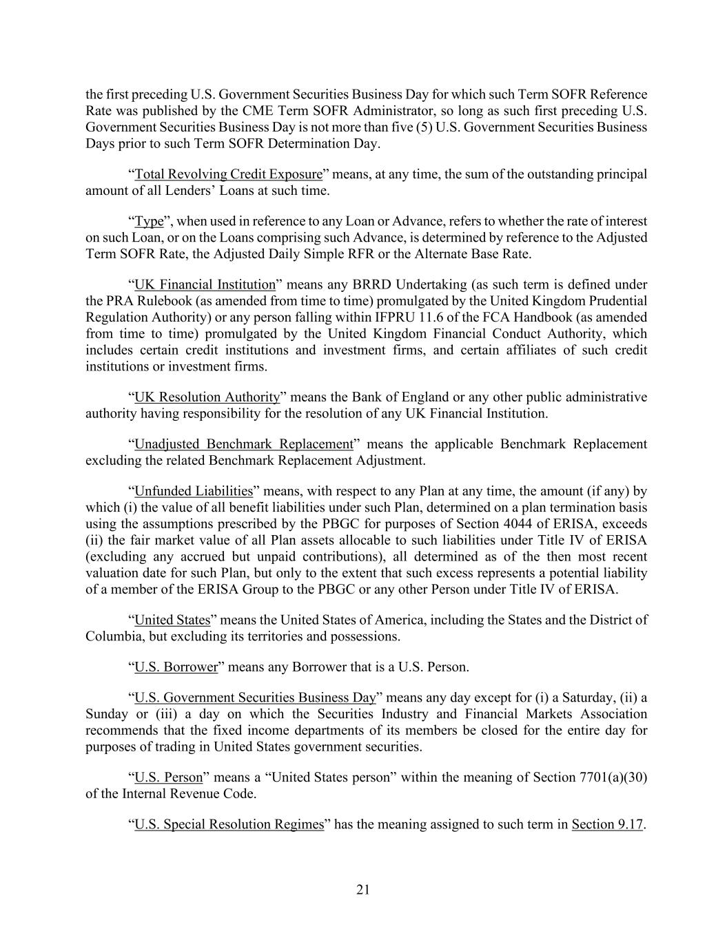 21 the first preceding U.S. Government Securities Business Day for which such Term SOFR Reference Rate was published by the CME Term SOFR Administrator, so long as such first preceding U.S. Government Securities Business Day is not more than five (5) U.S. Government Securities Business Days prior to such Term SOFR Determination Day. “Total Revolving Credit Exposure” means, at any time, the sum of the outstanding principal amount of all Lenders’ Loans at such time. “Type”, when used in reference to any Loan or Advance, refers to whether the rate of interest on such Loan, or on the Loans comprising such Advance, is determined by reference to the Adjusted Term SOFR Rate, the Adjusted Daily Simple RFR or the Alternate Base Rate. “UK Financial Institution” means any BRRD Undertaking (as such term is defined under the PRA Rulebook (as amended from time to time) promulgated by the United Kingdom Prudential Regulation Authority) or any person falling within IFPRU 11.6 of the FCA Handbook (as amended from time to time) promulgated by the United Kingdom Financial Conduct Authority, which includes certain credit institutions and investment firms, and certain affiliates of such credit institutions or investment firms. “UK Resolution Authority” means the Bank of England or any other public administrative authority having responsibility for the resolution of any UK Financial Institution. “Unadjusted Benchmark Replacement” means the applicable Benchmark Replacement excluding the related Benchmark Replacement Adjustment. “Unfunded Liabilities” means, with respect to any Plan at any time, the amount (if any) by which (i) the value of all benefit liabilities under such Plan, determined on a plan termination basis using the assumptions prescribed by the PBGC for purposes of Section 4044 of ERISA, exceeds (ii) the fair market value of all Plan assets allocable to such liabilities under Title IV of ERISA (excluding any accrued but unpaid contributions), all determined as of the then most recent valuation date for such Plan, but only to the extent that such excess represents a potential liability of a member of the ERISA Group to the PBGC or any other Person under Title IV of ERISA. “United States” means the United States of America, including the States and the District of Columbia, but excluding its territories and possessions. “U.S. Borrower” means any Borrower that is a U.S. Person. “U.S. Government Securities Business Day” means any day except for (i) a Saturday, (ii) a Sunday or (iii) a day on which the Securities Industry and Financial Markets Association recommends that the fixed income departments of its members be closed for the entire day for purposes of trading in United States government securities. “U.S. Person” means a “United States person” within the meaning of Section 7701(a)(30) of the Internal Revenue Code. “U.S. Special Resolution Regimes” has the meaning assigned to such term in Section 9.17.