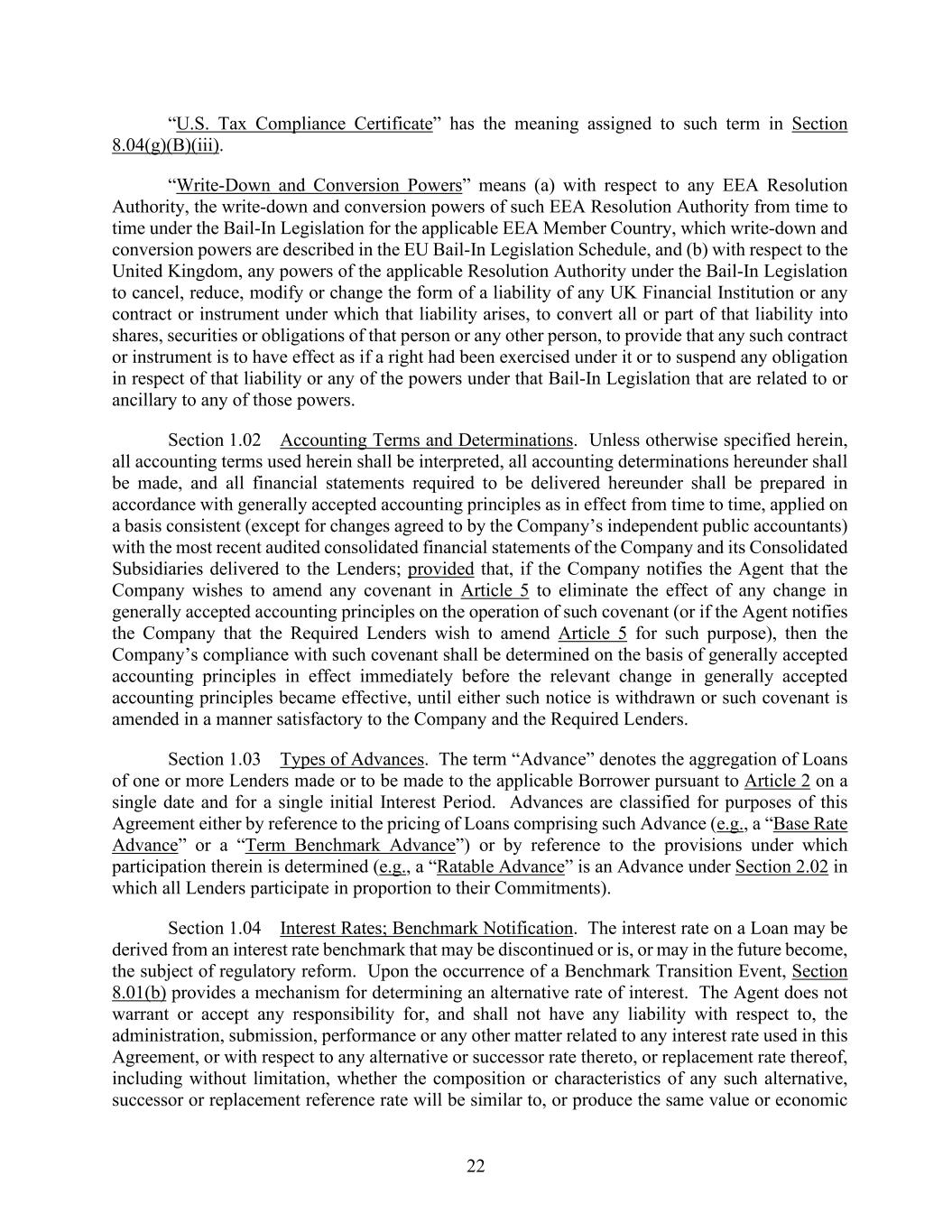 22 “U.S. Tax Compliance Certificate” has the meaning assigned to such term in Section 8.04(g)(B)(iii). “Write-Down and Conversion Powers” means (a) with respect to any EEA Resolution Authority, the write-down and conversion powers of such EEA Resolution Authority from time to time under the Bail-In Legislation for the applicable EEA Member Country, which write-down and conversion powers are described in the EU Bail-In Legislation Schedule, and (b) with respect to the United Kingdom, any powers of the applicable Resolution Authority under the Bail-In Legislation to cancel, reduce, modify or change the form of a liability of any UK Financial Institution or any contract or instrument under which that liability arises, to convert all or part of that liability into shares, securities or obligations of that person or any other person, to provide that any such contract or instrument is to have effect as if a right had been exercised under it or to suspend any obligation in respect of that liability or any of the powers under that Bail-In Legislation that are related to or ancillary to any of those powers. Section 1.02 Accounting Terms and Determinations. Unless otherwise specified herein, all accounting terms used herein shall be interpreted, all accounting determinations hereunder shall be made, and all financial statements required to be delivered hereunder shall be prepared in accordance with generally accepted accounting principles as in effect from time to time, applied on a basis consistent (except for changes agreed to by the Company’s independent public accountants) with the most recent audited consolidated financial statements of the Company and its Consolidated Subsidiaries delivered to the Lenders; provided that, if the Company notifies the Agent that the Company wishes to amend any covenant in Article 5 to eliminate the effect of any change in generally accepted accounting principles on the operation of such covenant (or if the Agent notifies the Company that the Required Lenders wish to amend Article 5 for such purpose), then the Company’s compliance with such covenant shall be determined on the basis of generally accepted accounting principles in effect immediately before the relevant change in generally accepted accounting principles became effective, until either such notice is withdrawn or such covenant is amended in a manner satisfactory to the Company and the Required Lenders. Section 1.03 Types of Advances. The term “Advance” denotes the aggregation of Loans of one or more Lenders made or to be made to the applicable Borrower pursuant to Article 2 on a single date and for a single initial Interest Period. Advances are classified for purposes of this Agreement either by reference to the pricing of Loans comprising such Advance (e.g., a “Base Rate Advance” or a “Term Benchmark Advance”) or by reference to the provisions under which participation therein is determined (e.g., a “Ratable Advance” is an Advance under Section 2.02 in which all Lenders participate in proportion to their Commitments). Section 1.04 Interest Rates; Benchmark Notification. The interest rate on a Loan may be derived from an interest rate benchmark that may be discontinued or is, or may in the future become, the subject of regulatory reform. Upon the occurrence of a Benchmark Transition Event, Section 8.01(b) provides a mechanism for determining an alternative rate of interest. The Agent does not warrant or accept any responsibility for, and shall not have any liability with respect to, the administration, submission, performance or any other matter related to any interest rate used in this Agreement, or with respect to any alternative or successor rate thereto, or replacement rate thereof, including without limitation, whether the composition or characteristics of any such alternative, successor or replacement reference rate will be similar to, or produce the same value or economic