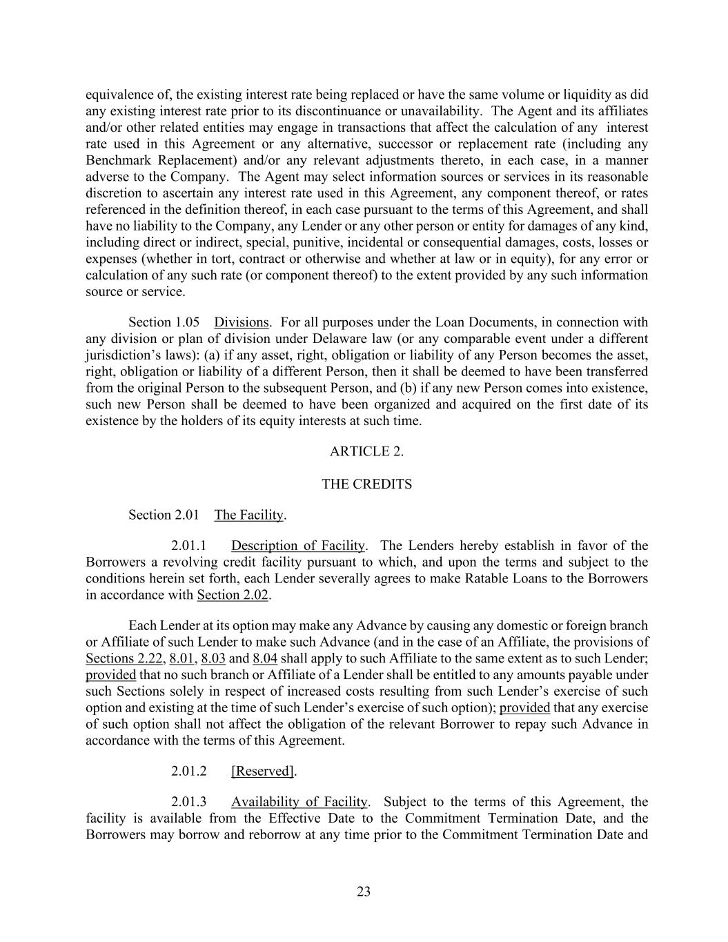 23 equivalence of, the existing interest rate being replaced or have the same volume or liquidity as did any existing interest rate prior to its discontinuance or unavailability. The Agent and its affiliates and/or other related entities may engage in transactions that affect the calculation of any interest rate used in this Agreement or any alternative, successor or replacement rate (including any Benchmark Replacement) and/or any relevant adjustments thereto, in each case, in a manner adverse to the Company. The Agent may select information sources or services in its reasonable discretion to ascertain any interest rate used in this Agreement, any component thereof, or rates referenced in the definition thereof, in each case pursuant to the terms of this Agreement, and shall have no liability to the Company, any Lender or any other person or entity for damages of any kind, including direct or indirect, special, punitive, incidental or consequential damages, costs, losses or expenses (whether in tort, contract or otherwise and whether at law or in equity), for any error or calculation of any such rate (or component thereof) to the extent provided by any such information source or service. Section 1.05 Divisions. For all purposes under the Loan Documents, in connection with any division or plan of division under Delaware law (or any comparable event under a different jurisdiction’s laws): (a) if any asset, right, obligation or liability of any Person becomes the asset, right, obligation or liability of a different Person, then it shall be deemed to have been transferred from the original Person to the subsequent Person, and (b) if any new Person comes into existence, such new Person shall be deemed to have been organized and acquired on the first date of its existence by the holders of its equity interests at such time. ARTICLE 2. THE CREDITS Section 2.01 The Facility. 2.01.1 Description of Facility. The Lenders hereby establish in favor of the Borrowers a revolving credit facility pursuant to which, and upon the terms and subject to the conditions herein set forth, each Lender severally agrees to make Ratable Loans to the Borrowers in accordance with Section 2.02. Each Lender at its option may make any Advance by causing any domestic or foreign branch or Affiliate of such Lender to make such Advance (and in the case of an Affiliate, the provisions of Sections 2.22, 8.01, 8.03 and 8.04 shall apply to such Affiliate to the same extent as to such Lender; provided that no such branch or Affiliate of a Lender shall be entitled to any amounts payable under such Sections solely in respect of increased costs resulting from such Lender’s exercise of such option and existing at the time of such Lender’s exercise of such option); provided that any exercise of such option shall not affect the obligation of the relevant Borrower to repay such Advance in accordance with the terms of this Agreement. 2.01.2 [Reserved]. 2.01.3 Availability of Facility. Subject to the terms of this Agreement, the facility is available from the Effective Date to the Commitment Termination Date, and the Borrowers may borrow and reborrow at any time prior to the Commitment Termination Date and