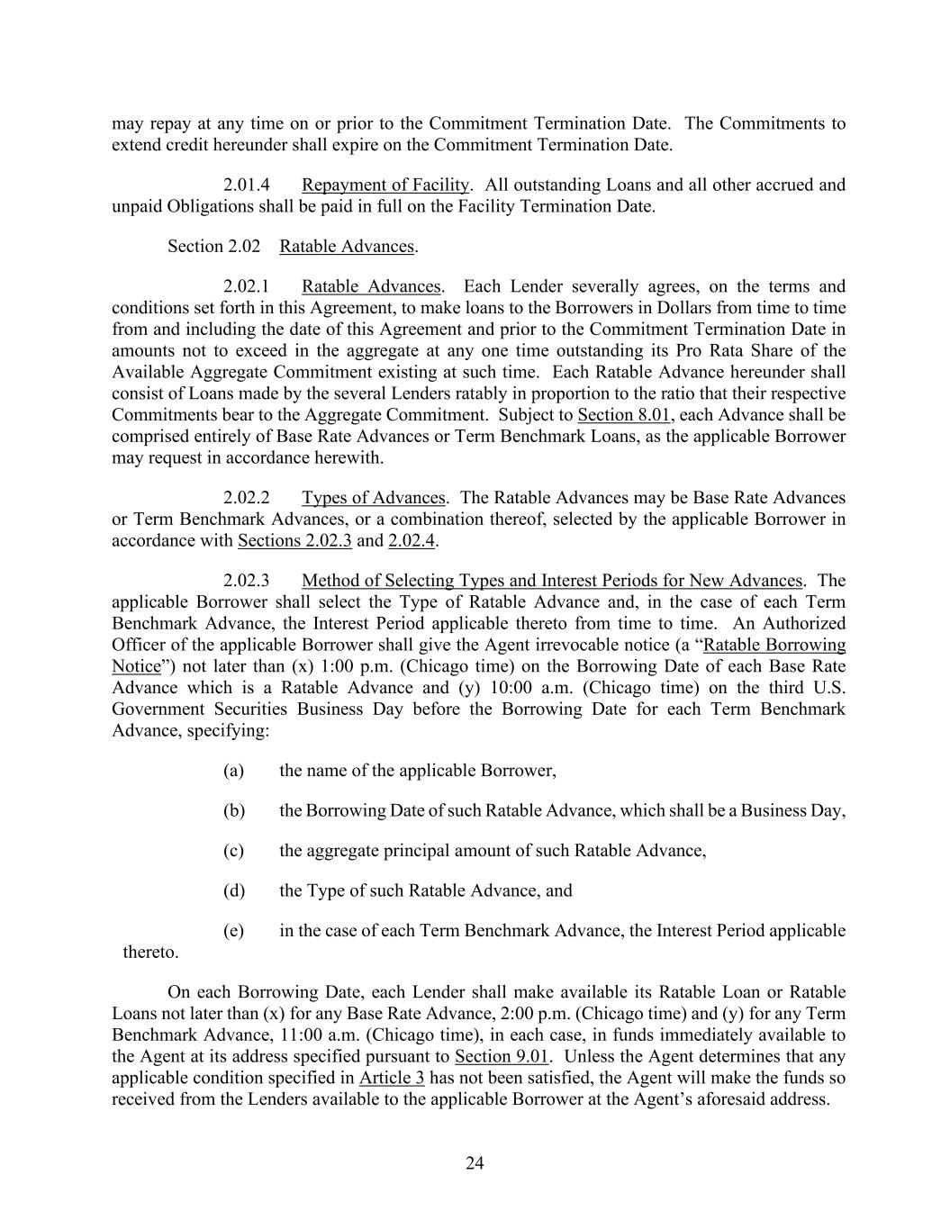 24 may repay at any time on or prior to the Commitment Termination Date. The Commitments to extend credit hereunder shall expire on the Commitment Termination Date. 2.01.4 Repayment of Facility. All outstanding Loans and all other accrued and unpaid Obligations shall be paid in full on the Facility Termination Date. Section 2.02 Ratable Advances. 2.02.1 Ratable Advances. Each Lender severally agrees, on the terms and conditions set forth in this Agreement, to make loans to the Borrowers in Dollars from time to time from and including the date of this Agreement and prior to the Commitment Termination Date in amounts not to exceed in the aggregate at any one time outstanding its Pro Rata Share of the Available Aggregate Commitment existing at such time. Each Ratable Advance hereunder shall consist of Loans made by the several Lenders ratably in proportion to the ratio that their respective Commitments bear to the Aggregate Commitment. Subject to Section 8.01, each Advance shall be comprised entirely of Base Rate Advances or Term Benchmark Loans, as the applicable Borrower may request in accordance herewith. 2.02.2 Types of Advances. The Ratable Advances may be Base Rate Advances or Term Benchmark Advances, or a combination thereof, selected by the applicable Borrower in accordance with Sections 2.02.3 and 2.02.4. 2.02.3 Method of Selecting Types and Interest Periods for New Advances. The applicable Borrower shall select the Type of Ratable Advance and, in the case of each Term Benchmark Advance, the Interest Period applicable thereto from time to time. An Authorized Officer of the applicable Borrower shall give the Agent irrevocable notice (a “Ratable Borrowing Notice”) not later than (x) 1:00 p.m. (Chicago time) on the Borrowing Date of each Base Rate Advance which is a Ratable Advance and (y) 10:00 a.m. (Chicago time) on the third U.S. Government Securities Business Day before the Borrowing Date for each Term Benchmark Advance, specifying: (a) the name of the applicable Borrower, (b) the Borrowing Date of such Ratable Advance, which shall be a Business Day, (c) the aggregate principal amount of such Ratable Advance, (d) the Type of such Ratable Advance, and (e) in the case of each Term Benchmark Advance, the Interest Period applicable thereto. On each Borrowing Date, each Lender shall make available its Ratable Loan or Ratable Loans not later than (x) for any Base Rate Advance, 2:00 p.m. (Chicago time) and (y) for any Term Benchmark Advance, 11:00 a.m. (Chicago time), in each case, in funds immediately available to the Agent at its address specified pursuant to Section 9.01. Unless the Agent determines that any applicable condition specified in Article 3 has not been satisfied, the Agent will make the funds so received from the Lenders available to the applicable Borrower at the Agent’s aforesaid address.