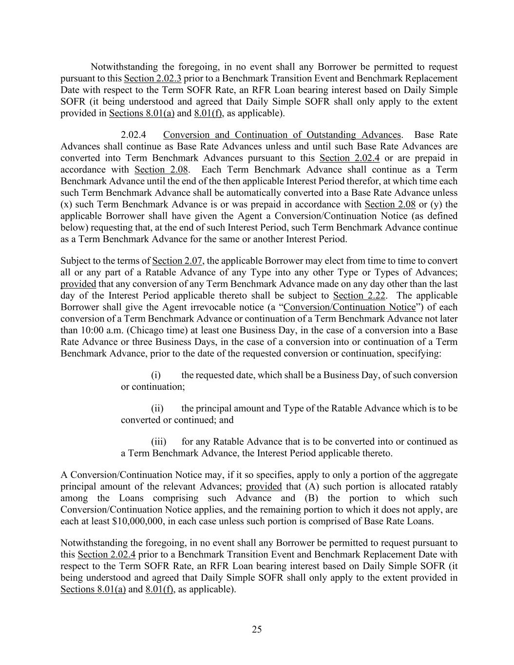25 Notwithstanding the foregoing, in no event shall any Borrower be permitted to request pursuant to this Section 2.02.3 prior to a Benchmark Transition Event and Benchmark Replacement Date with respect to the Term SOFR Rate, an RFR Loan bearing interest based on Daily Simple SOFR (it being understood and agreed that Daily Simple SOFR shall only apply to the extent provided in Sections 8.01(a) and 8.01(f), as applicable). 2.02.4 Conversion and Continuation of Outstanding Advances. Base Rate Advances shall continue as Base Rate Advances unless and until such Base Rate Advances are converted into Term Benchmark Advances pursuant to this Section 2.02.4 or are prepaid in accordance with Section 2.08. Each Term Benchmark Advance shall continue as a Term Benchmark Advance until the end of the then applicable Interest Period therefor, at which time each such Term Benchmark Advance shall be automatically converted into a Base Rate Advance unless (x) such Term Benchmark Advance is or was prepaid in accordance with Section 2.08 or (y) the applicable Borrower shall have given the Agent a Conversion/Continuation Notice (as defined below) requesting that, at the end of such Interest Period, such Term Benchmark Advance continue as a Term Benchmark Advance for the same or another Interest Period. Subject to the terms of Section 2.07, the applicable Borrower may elect from time to time to convert all or any part of a Ratable Advance of any Type into any other Type or Types of Advances; provided that any conversion of any Term Benchmark Advance made on any day other than the last day of the Interest Period applicable thereto shall be subject to Section 2.22. The applicable Borrower shall give the Agent irrevocable notice (a “Conversion/Continuation Notice”) of each conversion of a Term Benchmark Advance or continuation of a Term Benchmark Advance not later than 10:00 a.m. (Chicago time) at least one Business Day, in the case of a conversion into a Base Rate Advance or three Business Days, in the case of a conversion into or continuation of a Term Benchmark Advance, prior to the date of the requested conversion or continuation, specifying: (i) the requested date, which shall be a Business Day, of such conversion or continuation; (ii) the principal amount and Type of the Ratable Advance which is to be converted or continued; and (iii) for any Ratable Advance that is to be converted into or continued as a Term Benchmark Advance, the Interest Period applicable thereto. A Conversion/Continuation Notice may, if it so specifies, apply to only a portion of the aggregate principal amount of the relevant Advances; provided that (A) such portion is allocated ratably among the Loans comprising such Advance and (B) the portion to which such Conversion/Continuation Notice applies, and the remaining portion to which it does not apply, are each at least $10,000,000, in each case unless such portion is comprised of Base Rate Loans. Notwithstanding the foregoing, in no event shall any Borrower be permitted to request pursuant to this Section 2.02.4 prior to a Benchmark Transition Event and Benchmark Replacement Date with respect to the Term SOFR Rate, an RFR Loan bearing interest based on Daily Simple SOFR (it being understood and agreed that Daily Simple SOFR shall only apply to the extent provided in Sections 8.01(a) and 8.01(f), as applicable).
