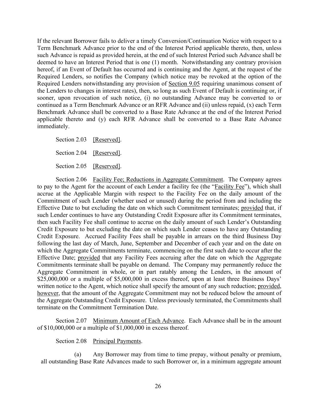 26 If the relevant Borrower fails to deliver a timely Conversion/Continuation Notice with respect to a Term Benchmark Advance prior to the end of the Interest Period applicable thereto, then, unless such Advance is repaid as provided herein, at the end of such Interest Period such Advance shall be deemed to have an Interest Period that is one (1) month. Notwithstanding any contrary provision hereof, if an Event of Default has occurred and is continuing and the Agent, at the request of the Required Lenders, so notifies the Company (which notice may be revoked at the option of the Required Lenders notwithstanding any provision of Section 9.05 requiring unanimous consent of the Lenders to changes in interest rates), then, so long as such Event of Default is continuing or, if sooner, upon revocation of such notice, (i) no outstanding Advance may be converted to or continued as a Term Benchmark Advance or an RFR Advance and (ii) unless repaid, (x) each Term Benchmark Advance shall be converted to a Base Rate Advance at the end of the Interest Period applicable thereto and (y) each RFR Advance shall be converted to a Base Rate Advance immediately. Section 2.03 [Reserved]. Section 2.04 [Reserved]. Section 2.05 [Reserved]. Section 2.06 Facility Fee; Reductions in Aggregate Commitment. The Company agrees to pay to the Agent for the account of each Lender a facility fee (the “Facility Fee”), which shall accrue at the Applicable Margin with respect to the Facility Fee on the daily amount of the Commitment of such Lender (whether used or unused) during the period from and including the Effective Date to but excluding the date on which such Commitment terminates; provided that, if such Lender continues to have any Outstanding Credit Exposure after its Commitment terminates, then such Facility Fee shall continue to accrue on the daily amount of such Lender’s Outstanding Credit Exposure to but excluding the date on which such Lender ceases to have any Outstanding Credit Exposure. Accrued Facility Fees shall be payable in arrears on the third Business Day following the last day of March, June, September and December of each year and on the date on which the Aggregate Commitments terminate, commencing on the first such date to occur after the Effective Date; provided that any Facility Fees accruing after the date on which the Aggregate Commitments terminate shall be payable on demand. The Company may permanently reduce the Aggregate Commitment in whole, or in part ratably among the Lenders, in the amount of $25,000,000 or a multiple of $5,000,000 in excess thereof, upon at least three Business Days’ written notice to the Agent, which notice shall specify the amount of any such reduction; provided, however, that the amount of the Aggregate Commitment may not be reduced below the amount of the Aggregate Outstanding Credit Exposure. Unless previously terminated, the Commitments shall terminate on the Commitment Termination Date. Section 2.07 Minimum Amount of Each Advance. Each Advance shall be in the amount of $10,000,000 or a multiple of $1,000,000 in excess thereof. Section 2.08 Principal Payments. (a) Any Borrower may from time to time prepay, without penalty or premium, all outstanding Base Rate Advances made to such Borrower or, in a minimum aggregate amount