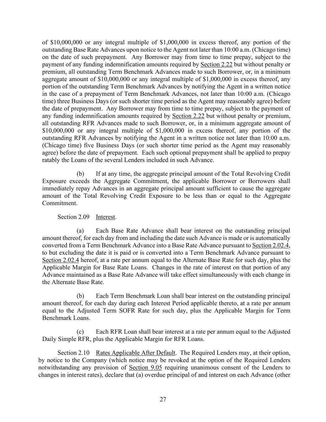 27 of $10,000,000 or any integral multiple of $1,000,000 in excess thereof, any portion of the outstanding Base Rate Advances upon notice to the Agent not later than 10:00 a.m. (Chicago time) on the date of such prepayment. Any Borrower may from time to time prepay, subject to the payment of any funding indemnification amounts required by Section 2.22 but without penalty or premium, all outstanding Term Benchmark Advances made to such Borrower, or, in a minimum aggregate amount of $10,000,000 or any integral multiple of $1,000,000 in excess thereof, any portion of the outstanding Term Benchmark Advances by notifying the Agent in a written notice in the case of a prepayment of Term Benchmark Advances, not later than 10:00 a.m. (Chicago time) three Business Days (or such shorter time period as the Agent may reasonably agree) before the date of prepayment. Any Borrower may from time to time prepay, subject to the payment of any funding indemnification amounts required by Section 2.22 but without penalty or premium, all outstanding RFR Advances made to such Borrower, or, in a minimum aggregate amount of $10,000,000 or any integral multiple of $1,000,000 in excess thereof, any portion of the outstanding RFR Advances by notifying the Agent in a written notice not later than 10:00 a.m. (Chicago time) five Business Days (or such shorter time period as the Agent may reasonably agree) before the date of prepayment. Each such optional prepayment shall be applied to prepay ratably the Loans of the several Lenders included in such Advance. (b) If at any time, the aggregate principal amount of the Total Revolving Credit Exposure exceeds the Aggregate Commitment, the applicable Borrower or Borrowers shall immediately repay Advances in an aggregate principal amount sufficient to cause the aggregate amount of the Total Revolving Credit Exposure to be less than or equal to the Aggregate Commitment. Section 2.09 Interest. (a) Each Base Rate Advance shall bear interest on the outstanding principal amount thereof, for each day from and including the date such Advance is made or is automatically converted from a Term Benchmark Advance into a Base Rate Advance pursuant to Section 2.02.4, to but excluding the date it is paid or is converted into a Term Benchmark Advance pursuant to Section 2.02.4 hereof, at a rate per annum equal to the Alternate Base Rate for such day, plus the Applicable Margin for Base Rate Loans. Changes in the rate of interest on that portion of any Advance maintained as a Base Rate Advance will take effect simultaneously with each change in the Alternate Base Rate. (b) Each Term Benchmark Loan shall bear interest on the outstanding principal amount thereof, for each day during each Interest Period applicable thereto, at a rate per annum equal to the Adjusted Term SOFR Rate for such day, plus the Applicable Margin for Term Benchmark Loans. (c) Each RFR Loan shall bear interest at a rate per annum equal to the Adjusted Daily Simple RFR, plus the Applicable Margin for RFR Loans. Section 2.10 Rates Applicable After Default. The Required Lenders may, at their option, by notice to the Company (which notice may be revoked at the option of the Required Lenders notwithstanding any provision of Section 9.05 requiring unanimous consent of the Lenders to changes in interest rates), declare that (a) overdue principal of and interest on each Advance (other