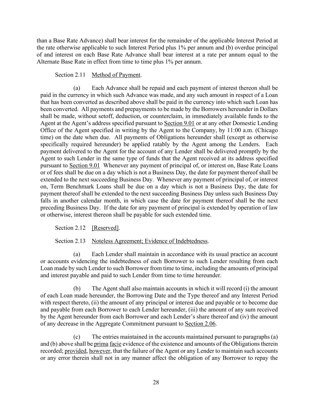 28 than a Base Rate Advance) shall bear interest for the remainder of the applicable Interest Period at the rate otherwise applicable to such Interest Period plus 1% per annum and (b) overdue principal of and interest on each Base Rate Advance shall bear interest at a rate per annum equal to the Alternate Base Rate in effect from time to time plus 1% per annum. Section 2.11 Method of Payment. (a) Each Advance shall be repaid and each payment of interest thereon shall be paid in the currency in which such Advance was made, and any such amount in respect of a Loan that has been converted as described above shall be paid in the currency into which such Loan has been converted. All payments and prepayments to be made by the Borrowers hereunder in Dollars shall be made, without setoff, deduction, or counterclaim, in immediately available funds to the Agent at the Agent’s address specified pursuant to Section 9.01 or at any other Domestic Lending Office of the Agent specified in writing by the Agent to the Company, by 11:00 a.m. (Chicago time) on the date when due. All payments of Obligations hereunder shall (except as otherwise specifically required hereunder) be applied ratably by the Agent among the Lenders. Each payment delivered to the Agent for the account of any Lender shall be delivered promptly by the Agent to such Lender in the same type of funds that the Agent received at its address specified pursuant to Section 9.01 Whenever any payment of principal of, or interest on, Base Rate Loans or of fees shall be due on a day which is not a Business Day, the date for payment thereof shall be extended to the next succeeding Business Day. Whenever any payment of principal of, or interest on, Term Benchmark Loans shall be due on a day which is not a Business Day, the date for payment thereof shall be extended to the next succeeding Business Day unless such Business Day falls in another calendar month, in which case the date for payment thereof shall be the next preceding Business Day. If the date for any payment of principal is extended by operation of law or otherwise, interest thereon shall be payable for such extended time. Section 2.12 [Reserved]. Section 2.13 Noteless Agreement; Evidence of Indebtedness. (a) Each Lender shall maintain in accordance with its usual practice an account or accounts evidencing the indebtedness of each Borrower to such Lender resulting from each Loan made by such Lender to such Borrower from time to time, including the amounts of principal and interest payable and paid to such Lender from time to time hereunder. (b) The Agent shall also maintain accounts in which it will record (i) the amount of each Loan made hereunder, the Borrowing Date and the Type thereof and any Interest Period with respect thereto, (ii) the amount of any principal or interest due and payable or to become due and payable from each Borrower to each Lender hereunder, (iii) the amount of any sum received by the Agent hereunder from each Borrower and each Lender’s share thereof and (iv) the amount of any decrease in the Aggregate Commitment pursuant to Section 2.06. (c) The entries maintained in the accounts maintained pursuant to paragraphs (a) and (b) above shall be prima facie evidence of the existence and amounts of the Obligations therein recorded; provided, however, that the failure of the Agent or any Lender to maintain such accounts or any error therein shall not in any manner affect the obligation of any Borrower to repay the