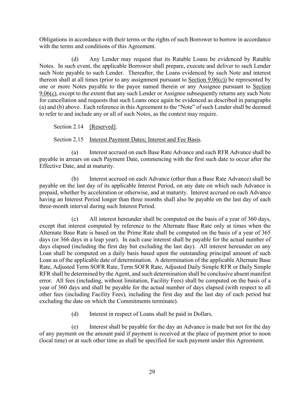 29 Obligations in accordance with their terms or the rights of such Borrower to borrow in accordance with the terms and conditions of this Agreement. (d) Any Lender may request that its Ratable Loans be evidenced by Ratable Notes. In such event, the applicable Borrower shall prepare, execute and deliver to such Lender such Note payable to such Lender. Thereafter, the Loans evidenced by such Note and interest thereon shall at all times (prior to any assignment pursuant to Section 9.06(c)) be represented by one or more Notes payable to the payee named therein or any Assignee pursuant to Section 9.06(c), except to the extent that any such Lender or Assignee subsequently returns any such Note for cancellation and requests that such Loans once again be evidenced as described in paragraphs (a) and (b) above. Each reference in this Agreement to the “Note” of such Lender shall be deemed to refer to and include any or all of such Notes, as the context may require. Section 2.14 [Reserved]. Section 2.15 Interest Payment Dates; Interest and Fee Basis. (a) Interest accrued on each Base Rate Advance and each RFR Advance shall be payable in arrears on each Payment Date, commencing with the first such date to occur after the Effective Date, and at maturity. (b) Interest accrued on each Advance (other than a Base Rate Advance) shall be payable on the last day of its applicable Interest Period, on any date on which such Advance is prepaid, whether by acceleration or otherwise, and at maturity. Interest accrued on each Advance having an Interest Period longer than three months shall also be payable on the last day of each three-month interval during such Interest Period. (c) All interest hereunder shall be computed on the basis of a year of 360 days, except that interest computed by reference to the Alternate Base Rate only at times when the Alternate Base Rate is based on the Prime Rate shall be computed on the basis of a year of 365 days (or 366 days in a leap year). In each case interest shall be payable for the actual number of days elapsed (including the first day but excluding the last day). All interest hereunder on any Loan shall be computed on a daily basis based upon the outstanding principal amount of such Loan as of the applicable date of determination. A determination of the applicable Alternate Base Rate, Adjusted Term SOFR Rate, Term SOFR Rate, Adjusted Daily Simple RFR or Daily Simple RFR shall be determined by the Agent, and such determination shall be conclusive absent manifest error. All fees (including, without limitation, Facility Fees) shall be computed on the basis of a year of 360 days and shall be payable for the actual number of days elapsed (with respect to all other fees (including Facility Fees), including the first day and the last day of each period but excluding the date on which the Commitments terminate). (d) Interest in respect of Loans shall be paid in Dollars. (e) Interest shall be payable for the day an Advance is made but not for the day of any payment on the amount paid if payment is received at the place of payment prior to noon (local time) or at such other time as shall be specified for such payment under this Agreement.