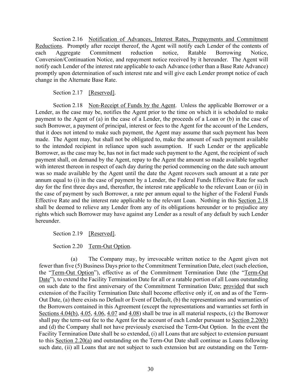 30 Section 2.16 Notification of Advances, Interest Rates, Prepayments and Commitment Reductions. Promptly after receipt thereof, the Agent will notify each Lender of the contents of each Aggregate Commitment reduction notice, Ratable Borrowing Notice, Conversion/Continuation Notice, and repayment notice received by it hereunder. The Agent will notify each Lender of the interest rate applicable to each Advance (other than a Base Rate Advance) promptly upon determination of such interest rate and will give each Lender prompt notice of each change in the Alternate Base Rate. Section 2.17 [Reserved]. Section 2.18 Non-Receipt of Funds by the Agent. Unless the applicable Borrower or a Lender, as the case may be, notifies the Agent prior to the time on which it is scheduled to make payment to the Agent of (a) in the case of a Lender, the proceeds of a Loan or (b) in the case of such Borrower, a payment of principal, interest or fees to the Agent for the account of the Lenders, that it does not intend to make such payment, the Agent may assume that such payment has been made. The Agent may, but shall not be obligated to, make the amount of such payment available to the intended recipient in reliance upon such assumption. If such Lender or the applicable Borrower, as the case may be, has not in fact made such payment to the Agent, the recipient of such payment shall, on demand by the Agent, repay to the Agent the amount so made available together with interest thereon in respect of each day during the period commencing on the date such amount was so made available by the Agent until the date the Agent recovers such amount at a rate per annum equal to (i) in the case of payment by a Lender, the Federal Funds Effective Rate for such day for the first three days and, thereafter, the interest rate applicable to the relevant Loan or (ii) in the case of payment by such Borrower, a rate per annum equal to the higher of the Federal Funds Effective Rate and the interest rate applicable to the relevant Loan. Nothing in this Section 2.18 shall be deemed to relieve any Lender from any of its obligations hereunder or to prejudice any rights which such Borrower may have against any Lender as a result of any default by such Lender hereunder. Section 2.19 [Reserved]. Section 2.20 Term-Out Option. (a) The Company may, by irrevocable written notice to the Agent given not fewer than five (5) Business Days prior to the Commitment Termination Date, elect (such election, the “Term-Out Option”), effective as of the Commitment Termination Date (the “Term-Out Date”), to extend the Facility Termination Date for all or a ratable portion of all Loans outstanding on such date to the first anniversary of the Commitment Termination Date; provided that such extension of the Facility Termination Date shall become effective only if, on and as of the Term- Out Date, (a) there exists no Default or Event of Default, (b) the representations and warranties of the Borrowers contained in this Agreement (except the representations and warranties set forth in Sections 4.04(b), 4.05, 4.06, 4.07 and 4.08) shall be true in all material respects, (c) the Borrower shall pay the term-out fee to the Agent for the account of each Lender pursuant to Section 2.20(b) and (d) the Company shall not have previously exercised the Term-Out Option. In the event the Facility Termination Date shall be so extended, (i) all Loans that are subject to extension pursuant to this Section 2.20(a) and outstanding on the Term-Out Date shall continue as Loans following such date, (ii) all Loans that are not subject to such extension but are outstanding on the Term-
