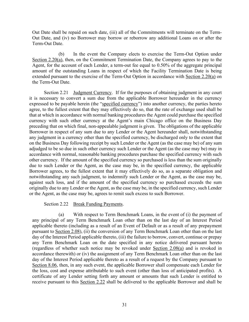 31 Out Date shall be repaid on such date, (iii) all of the Commitments will terminate on the Term- Out Date, and (iv) no Borrower may borrow or reborrow any additional Loans on or after the Term-Out Date. (b) In the event the Company elects to exercise the Term-Out Option under Section 2.20(a), then, on the Commitment Termination Date, the Company agrees to pay to the Agent, for the account of each Lender, a term-out fee equal to 0.50% of the aggregate principal amount of the outstanding Loans in respect of which the Facility Termination Date is being extended pursuant to the exercise of the Term-Out Option in accordance with Section 2.20(a) on the Term-Out Date. Section 2.21 Judgment Currency. If for the purposes of obtaining judgment in any court it is necessary to convert a sum due from the applicable Borrower hereunder in the currency expressed to be payable herein (the “specified currency”) into another currency, the parties hereto agree, to the fullest extent that they may effectively do so, that the rate of exchange used shall be that at which in accordance with normal banking procedures the Agent could purchase the specified currency with such other currency at the Agent’s main Chicago office on the Business Day preceding that on which final, non-appealable judgment is given. The obligations of the applicable Borrower in respect of any sum due to any Lender or the Agent hereunder shall, notwithstanding any judgment in a currency other than the specified currency, be discharged only to the extent that on the Business Day following receipt by such Lender or the Agent (as the case may be) of any sum adjudged to be so due in such other currency such Lender or the Agent (as the case may be) may in accordance with normal, reasonable banking procedures purchase the specified currency with such other currency. If the amount of the specified currency so purchased is less than the sum originally due to such Lender or the Agent, as the case may be, in the specified currency, the applicable Borrower agrees, to the fullest extent that it may effectively do so, as a separate obligation and notwithstanding any such judgment, to indemnify such Lender or the Agent, as the case may be, against such loss, and if the amount of the specified currency so purchased exceeds the sum originally due to any Lender or the Agent, as the case may be, in the specified currency, such Lender or the Agent, as the case may be, agrees to remit such excess to such Borrower. Section 2.22 Break Funding Payments. (a) With respect to Term Benchmark Loans, in the event of (i) the payment of any principal of any Term Benchmark Loan other than on the last day of an Interest Period applicable thereto (including as a result of an Event of Default or as a result of any prepayment pursuant to Section 2.08), (ii) the conversion of any Term Benchmark Loan other than on the last day of the Interest Period applicable thereto, (iii) the failure to borrow, convert, continue or prepay any Term Benchmark Loan on the date specified in any notice delivered pursuant hereto (regardless of whether such notice may be revoked under Section 2.08(a) and is revoked in accordance therewith) or (iv) the assignment of any Term Benchmark Loan other than on the last day of the Interest Period applicable thereto as a result of a request by the Company pursuant to Section 8.06, then, in any such event, the applicable Borrower shall compensate each Lender for the loss, cost and expense attributable to such event (other than loss of anticipated profits). A certificate of any Lender setting forth any amount or amounts that such Lender is entitled to receive pursuant to this Section 2.22 shall be delivered to the applicable Borrower and shall be