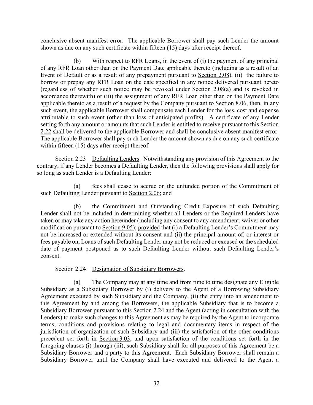 32 conclusive absent manifest error. The applicable Borrower shall pay such Lender the amount shown as due on any such certificate within fifteen (15) days after receipt thereof. (b) With respect to RFR Loans, in the event of (i) the payment of any principal of any RFR Loan other than on the Payment Date applicable thereto (including as a result of an Event of Default or as a result of any prepayment pursuant to Section 2.08), (ii) the failure to borrow or prepay any RFR Loan on the date specified in any notice delivered pursuant hereto (regardless of whether such notice may be revoked under Section 2.08(a) and is revoked in accordance therewith) or (iii) the assignment of any RFR Loan other than on the Payment Date applicable thereto as a result of a request by the Company pursuant to Section 8.06, then, in any such event, the applicable Borrower shall compensate each Lender for the loss, cost and expense attributable to such event (other than loss of anticipated profits). A certificate of any Lender setting forth any amount or amounts that such Lender is entitled to receive pursuant to this Section 2.22 shall be delivered to the applicable Borrower and shall be conclusive absent manifest error. The applicable Borrower shall pay such Lender the amount shown as due on any such certificate within fifteen (15) days after receipt thereof. Section 2.23 Defaulting Lenders. Notwithstanding any provision of this Agreement to the contrary, if any Lender becomes a Defaulting Lender, then the following provisions shall apply for so long as such Lender is a Defaulting Lender: (a) fees shall cease to accrue on the unfunded portion of the Commitment of such Defaulting Lender pursuant to Section 2.06; and (b) the Commitment and Outstanding Credit Exposure of such Defaulting Lender shall not be included in determining whether all Lenders or the Required Lenders have taken or may take any action hereunder (including any consent to any amendment, waiver or other modification pursuant to Section 9.05); provided that (i) a Defaulting Lender’s Commitment may not be increased or extended without its consent and (ii) the principal amount of, or interest or fees payable on, Loans of such Defaulting Lender may not be reduced or excused or the scheduled date of payment postponed as to such Defaulting Lender without such Defaulting Lender’s consent. Section 2.24 Designation of Subsidiary Borrowers. (a) The Company may at any time and from time to time designate any Eligible Subsidiary as a Subsidiary Borrower by (i) delivery to the Agent of a Borrowing Subsidiary Agreement executed by such Subsidiary and the Company, (ii) the entry into an amendment to this Agreement by and among the Borrowers, the applicable Subsidiary that is to become a Subsidiary Borrower pursuant to this Section 2.24 and the Agent (acting in consultation with the Lenders) to make such changes to this Agreement as may be required by the Agent to incorporate terms, conditions and provisions relating to legal and documentary items in respect of the jurisdiction of organization of such Subsidiary and (iii) the satisfaction of the other conditions precedent set forth in Section 3.03, and upon satisfaction of the conditions set forth in the foregoing clauses (i) through (iii), such Subsidiary shall for all purposes of this Agreement be a Subsidiary Borrower and a party to this Agreement. Each Subsidiary Borrower shall remain a Subsidiary Borrower until the Company shall have executed and delivered to the Agent a