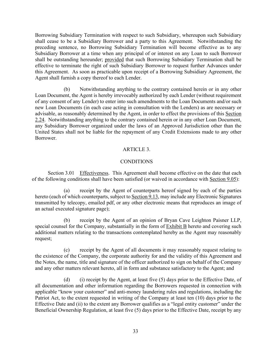 33 Borrowing Subsidiary Termination with respect to such Subsidiary, whereupon such Subsidiary shall cease to be a Subsidiary Borrower and a party to this Agreement. Notwithstanding the preceding sentence, no Borrowing Subsidiary Termination will become effective as to any Subsidiary Borrower at a time when any principal of or interest on any Loan to such Borrower shall be outstanding hereunder; provided that such Borrowing Subsidiary Termination shall be effective to terminate the right of such Subsidiary Borrower to request further Advances under this Agreement. As soon as practicable upon receipt of a Borrowing Subsidiary Agreement, the Agent shall furnish a copy thereof to each Lender. (b) Notwithstanding anything to the contrary contained herein or in any other Loan Document, the Agent is hereby irrevocably authorized by each Lender (without requirement of any consent of any Lender) to enter into such amendments to the Loan Documents and/or such new Loan Documents (in each case acting in consultation with the Lenders) as are necessary or advisable, as reasonably determined by the Agent, in order to effect the provisions of this Section 2.24. Notwithstanding anything to the contrary contained herein or in any other Loan Document, any Subsidiary Borrower organized under the laws of an Approved Jurisdiction other than the United States shall not be liable for the repayment of any Credit Extensions made to any other Borrower. ARTICLE 3. CONDITIONS Section 3.01 Effectiveness. This Agreement shall become effective on the date that each of the following conditions shall have been satisfied (or waived in accordance with Section 9.05): (a) receipt by the Agent of counterparts hereof signed by each of the parties hereto (each of which counterparts, subject to Section 9.13, may include any Electronic Signatures transmitted by telecopy, emailed pdf, or any other electronic means that reproduces an image of an actual executed signature page); (b) receipt by the Agent of an opinion of Bryan Cave Leighton Paisner LLP, special counsel for the Company, substantially in the form of Exhibit B hereto and covering such additional matters relating to the transactions contemplated hereby as the Agent may reasonably request; (c) receipt by the Agent of all documents it may reasonably request relating to the existence of the Company, the corporate authority for and the validity of this Agreement and the Notes, the name, title and signature of the officer authorized to sign on behalf of the Company and any other matters relevant hereto, all in form and substance satisfactory to the Agent; and (d) (i) receipt by the Agent, at least five (5) days prior to the Effective Date, of all documentation and other information regarding the Borrowers requested in connection with applicable “know your customer” and anti-money laundering rules and regulations, including the Patriot Act, to the extent requested in writing of the Company at least ten (10) days prior to the Effective Date and (ii) to the extent any Borrower qualifies as a “legal entity customer” under the Beneficial Ownership Regulation, at least five (5) days prior to the Effective Date, receipt by any