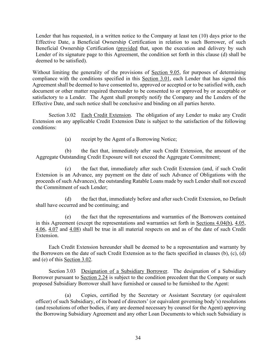 34 Lender that has requested, in a written notice to the Company at least ten (10) days prior to the Effective Date, a Beneficial Ownership Certification in relation to such Borrower, of such Beneficial Ownership Certification (provided that, upon the execution and delivery by such Lender of its signature page to this Agreement, the condition set forth in this clause (d) shall be deemed to be satisfied). Without limiting the generality of the provisions of Section 9.05, for purposes of determining compliance with the conditions specified in this Section 3.01, each Lender that has signed this Agreement shall be deemed to have consented to, approved or accepted or to be satisfied with, each document or other matter required thereunder to be consented to or approved by or acceptable or satisfactory to a Lender. The Agent shall promptly notify the Company and the Lenders of the Effective Date, and such notice shall be conclusive and binding on all parties hereto. Section 3.02 Each Credit Extension. The obligation of any Lender to make any Credit Extension on any applicable Credit Extension Date is subject to the satisfaction of the following conditions: (a) receipt by the Agent of a Borrowing Notice; (b) the fact that, immediately after such Credit Extension, the amount of the Aggregate Outstanding Credit Exposure will not exceed the Aggregate Commitment; (c) the fact that, immediately after such Credit Extension (and, if such Credit Extension is an Advance, any payment on the date of such Advance of Obligations with the proceeds of such Advances), the outstanding Ratable Loans made by such Lender shall not exceed the Commitment of such Lender; (d) the fact that, immediately before and after such Credit Extension, no Default shall have occurred and be continuing; and (e) the fact that the representations and warranties of the Borrowers contained in this Agreement (except the representations and warranties set forth in Sections 4.04(b), 4.05, 4.06, 4.07 and 4.08) shall be true in all material respects on and as of the date of such Credit Extension. Each Credit Extension hereunder shall be deemed to be a representation and warranty by the Borrowers on the date of such Credit Extension as to the facts specified in clauses (b), (c), (d) and (e) of this Section 3.02. Section 3.03 Designation of a Subsidiary Borrower. The designation of a Subsidiary Borrower pursuant to Section 2.24 is subject to the condition precedent that the Company or such proposed Subsidiary Borrower shall have furnished or caused to be furnished to the Agent: (a) Copies, certified by the Secretary or Assistant Secretary (or equivalent officer) of such Subsidiary, of its board of directors’ (or equivalent governing body’s) resolutions (and resolutions of other bodies, if any are deemed necessary by counsel for the Agent) approving the Borrowing Subsidiary Agreement and any other Loan Documents to which such Subsidiary is