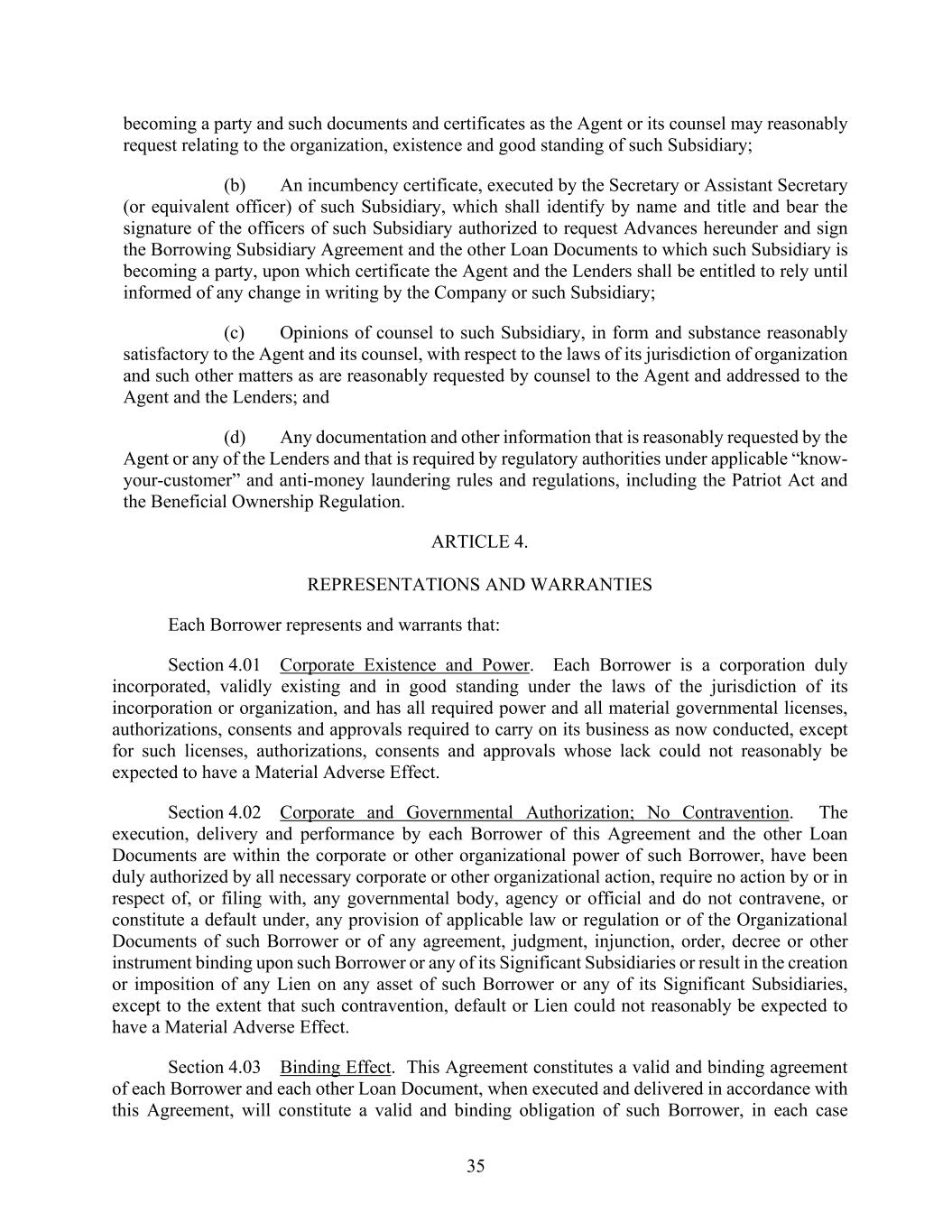 35 becoming a party and such documents and certificates as the Agent or its counsel may reasonably request relating to the organization, existence and good standing of such Subsidiary; (b) An incumbency certificate, executed by the Secretary or Assistant Secretary (or equivalent officer) of such Subsidiary, which shall identify by name and title and bear the signature of the officers of such Subsidiary authorized to request Advances hereunder and sign the Borrowing Subsidiary Agreement and the other Loan Documents to which such Subsidiary is becoming a party, upon which certificate the Agent and the Lenders shall be entitled to rely until informed of any change in writing by the Company or such Subsidiary; (c) Opinions of counsel to such Subsidiary, in form and substance reasonably satisfactory to the Agent and its counsel, with respect to the laws of its jurisdiction of organization and such other matters as are reasonably requested by counsel to the Agent and addressed to the Agent and the Lenders; and (d) Any documentation and other information that is reasonably requested by the Agent or any of the Lenders and that is required by regulatory authorities under applicable “know- your-customer” and anti-money laundering rules and regulations, including the Patriot Act and the Beneficial Ownership Regulation. ARTICLE 4. REPRESENTATIONS AND WARRANTIES Each Borrower represents and warrants that: Section 4.01 Corporate Existence and Power. Each Borrower is a corporation duly incorporated, validly existing and in good standing under the laws of the jurisdiction of its incorporation or organization, and has all required power and all material governmental licenses, authorizations, consents and approvals required to carry on its business as now conducted, except for such licenses, authorizations, consents and approvals whose lack could not reasonably be expected to have a Material Adverse Effect. Section 4.02 Corporate and Governmental Authorization; No Contravention. The execution, delivery and performance by each Borrower of this Agreement and the other Loan Documents are within the corporate or other organizational power of such Borrower, have been duly authorized by all necessary corporate or other organizational action, require no action by or in respect of, or filing with, any governmental body, agency or official and do not contravene, or constitute a default under, any provision of applicable law or regulation or of the Organizational Documents of such Borrower or of any agreement, judgment, injunction, order, decree or other instrument binding upon such Borrower or any of its Significant Subsidiaries or result in the creation or imposition of any Lien on any asset of such Borrower or any of its Significant Subsidiaries, except to the extent that such contravention, default or Lien could not reasonably be expected to have a Material Adverse Effect. Section 4.03 Binding Effect. This Agreement constitutes a valid and binding agreement of each Borrower and each other Loan Document, when executed and delivered in accordance with this Agreement, will constitute a valid and binding obligation of such Borrower, in each case