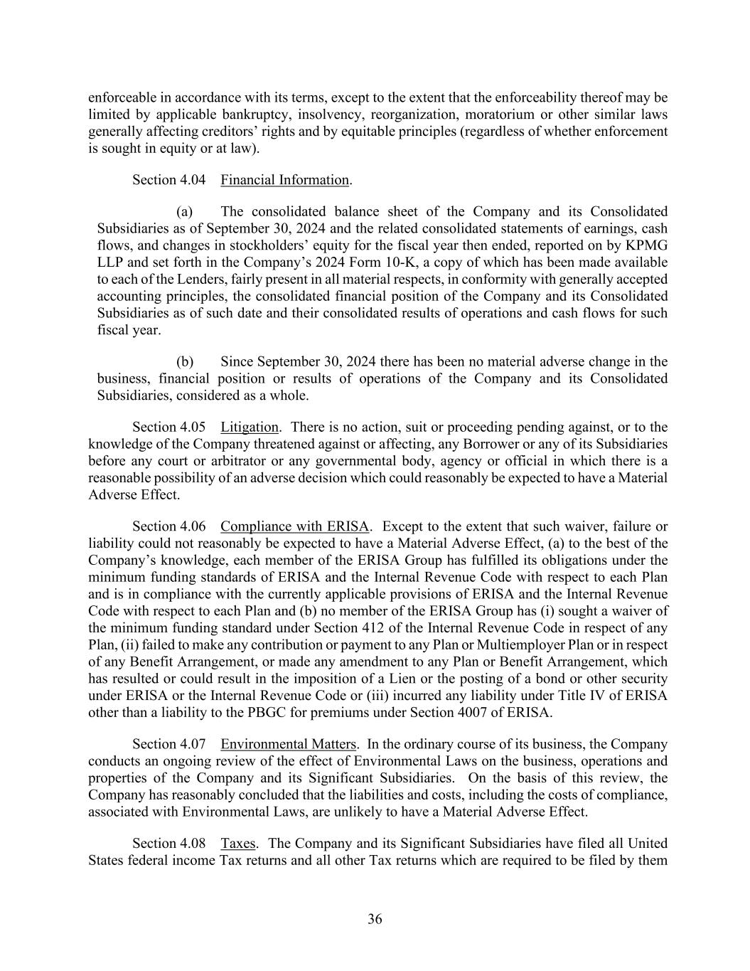 36 enforceable in accordance with its terms, except to the extent that the enforceability thereof may be limited by applicable bankruptcy, insolvency, reorganization, moratorium or other similar laws generally affecting creditors’ rights and by equitable principles (regardless of whether enforcement is sought in equity or at law). Section 4.04 Financial Information. (a) The consolidated balance sheet of the Company and its Consolidated Subsidiaries as of September 30, 2024 and the related consolidated statements of earnings, cash flows, and changes in stockholders’ equity for the fiscal year then ended, reported on by KPMG LLP and set forth in the Company’s 2024 Form 10-K, a copy of which has been made available to each of the Lenders, fairly present in all material respects, in conformity with generally accepted accounting principles, the consolidated financial position of the Company and its Consolidated Subsidiaries as of such date and their consolidated results of operations and cash flows for such fiscal year. (b) Since September 30, 2024 there has been no material adverse change in the business, financial position or results of operations of the Company and its Consolidated Subsidiaries, considered as a whole. Section 4.05 Litigation. There is no action, suit or proceeding pending against, or to the knowledge of the Company threatened against or affecting, any Borrower or any of its Subsidiaries before any court or arbitrator or any governmental body, agency or official in which there is a reasonable possibility of an adverse decision which could reasonably be expected to have a Material Adverse Effect. Section 4.06 Compliance with ERISA. Except to the extent that such waiver, failure or liability could not reasonably be expected to have a Material Adverse Effect, (a) to the best of the Company’s knowledge, each member of the ERISA Group has fulfilled its obligations under the minimum funding standards of ERISA and the Internal Revenue Code with respect to each Plan and is in compliance with the currently applicable provisions of ERISA and the Internal Revenue Code with respect to each Plan and (b) no member of the ERISA Group has (i) sought a waiver of the minimum funding standard under Section 412 of the Internal Revenue Code in respect of any Plan, (ii) failed to make any contribution or payment to any Plan or Multiemployer Plan or in respect of any Benefit Arrangement, or made any amendment to any Plan or Benefit Arrangement, which has resulted or could result in the imposition of a Lien or the posting of a bond or other security under ERISA or the Internal Revenue Code or (iii) incurred any liability under Title IV of ERISA other than a liability to the PBGC for premiums under Section 4007 of ERISA. Section 4.07 Environmental Matters. In the ordinary course of its business, the Company conducts an ongoing review of the effect of Environmental Laws on the business, operations and properties of the Company and its Significant Subsidiaries. On the basis of this review, the Company has reasonably concluded that the liabilities and costs, including the costs of compliance, associated with Environmental Laws, are unlikely to have a Material Adverse Effect. Section 4.08 Taxes. The Company and its Significant Subsidiaries have filed all United States federal income Tax returns and all other Tax returns which are required to be filed by them