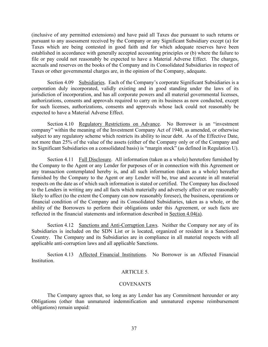 37 (inclusive of any permitted extensions) and have paid all Taxes due pursuant to such returns or pursuant to any assessment received by the Company or any Significant Subsidiary except (a) for Taxes which are being contested in good faith and for which adequate reserves have been established in accordance with generally accepted accounting principles or (b) where the failure to file or pay could not reasonably be expected to have a Material Adverse Effect. The charges, accruals and reserves on the books of the Company and its Consolidated Subsidiaries in respect of Taxes or other governmental charges are, in the opinion of the Company, adequate. Section 4.09 Subsidiaries. Each of the Company’s corporate Significant Subsidiaries is a corporation duly incorporated, validly existing and in good standing under the laws of its jurisdiction of incorporation, and has all corporate powers and all material governmental licenses, authorizations, consents and approvals required to carry on its business as now conducted, except for such licenses, authorizations, consents and approvals whose lack could not reasonably be expected to have a Material Adverse Effect. Section 4.10 Regulatory Restrictions on Advance. No Borrower is an “investment company” within the meaning of the Investment Company Act of 1940, as amended, or otherwise subject to any regulatory scheme which restricts its ability to incur debt. As of the Effective Date, not more than 25% of the value of the assets (either of the Company only or of the Company and its Significant Subsidiaries on a consolidated basis) is “margin stock” (as defined in Regulation U). Section 4.11 Full Disclosure. All information (taken as a whole) heretofore furnished by the Company to the Agent or any Lender for purposes of or in connection with this Agreement or any transaction contemplated hereby is, and all such information (taken as a whole) hereafter furnished by the Company to the Agent or any Lender will be, true and accurate in all material respects on the date as of which such information is stated or certified. The Company has disclosed to the Lenders in writing any and all facts which materially and adversely affect or are reasonably likely to affect (to the extent the Company can now reasonably foresee), the business, operations or financial condition of the Company and its Consolidated Subsidiaries, taken as a whole, or the ability of the Borrowers to perform their obligations under this Agreement, or such facts are reflected in the financial statements and information described in Section 4.04(a). Section 4.12 Sanctions and Anti-Corruption Laws. Neither the Company nor any of its Subsidiaries is included on the SDN List or is located, organized or resident in a Sanctioned Country. The Company and its Subsidiaries are in compliance in all material respects with all applicable anti-corruption laws and all applicable Sanctions. Section 4.13 Affected Financial Institutions. No Borrower is an Affected Financial Institution. ARTICLE 5. COVENANTS The Company agrees that, so long as any Lender has any Commitment hereunder or any Obligations (other than unmatured indemnification and unmatured expense reimbursement obligations) remain unpaid: