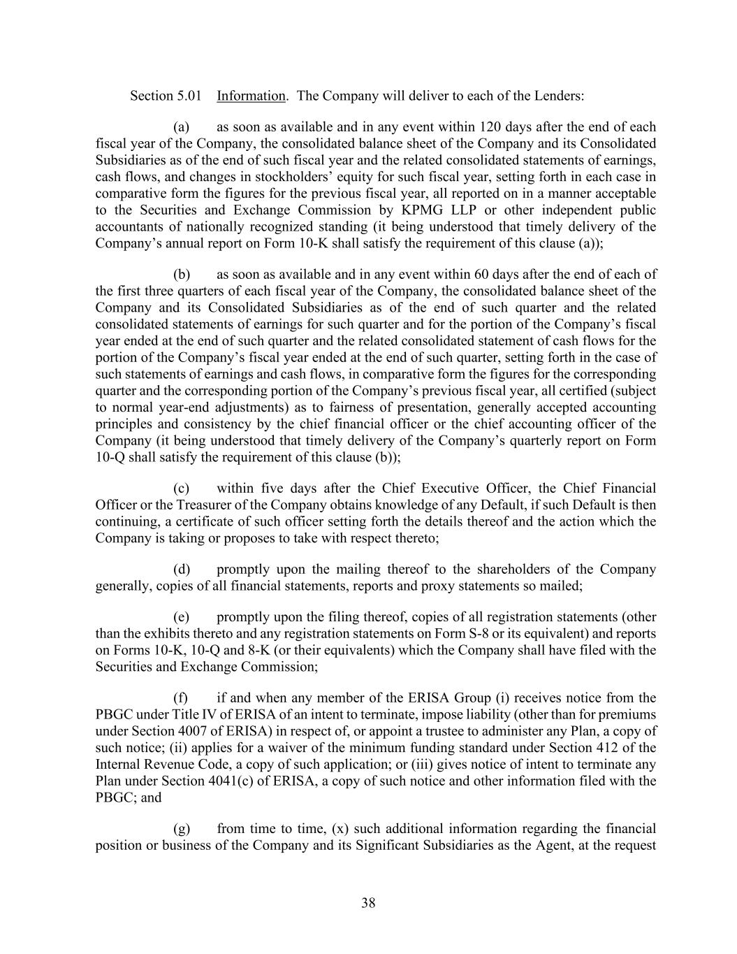 38 Section 5.01 Information. The Company will deliver to each of the Lenders: (a) as soon as available and in any event within 120 days after the end of each fiscal year of the Company, the consolidated balance sheet of the Company and its Consolidated Subsidiaries as of the end of such fiscal year and the related consolidated statements of earnings, cash flows, and changes in stockholders’ equity for such fiscal year, setting forth in each case in comparative form the figures for the previous fiscal year, all reported on in a manner acceptable to the Securities and Exchange Commission by KPMG LLP or other independent public accountants of nationally recognized standing (it being understood that timely delivery of the Company’s annual report on Form 10-K shall satisfy the requirement of this clause (a)); (b) as soon as available and in any event within 60 days after the end of each of the first three quarters of each fiscal year of the Company, the consolidated balance sheet of the Company and its Consolidated Subsidiaries as of the end of such quarter and the related consolidated statements of earnings for such quarter and for the portion of the Company’s fiscal year ended at the end of such quarter and the related consolidated statement of cash flows for the portion of the Company’s fiscal year ended at the end of such quarter, setting forth in the case of such statements of earnings and cash flows, in comparative form the figures for the corresponding quarter and the corresponding portion of the Company’s previous fiscal year, all certified (subject to normal year-end adjustments) as to fairness of presentation, generally accepted accounting principles and consistency by the chief financial officer or the chief accounting officer of the Company (it being understood that timely delivery of the Company’s quarterly report on Form 10-Q shall satisfy the requirement of this clause (b)); (c) within five days after the Chief Executive Officer, the Chief Financial Officer or the Treasurer of the Company obtains knowledge of any Default, if such Default is then continuing, a certificate of such officer setting forth the details thereof and the action which the Company is taking or proposes to take with respect thereto; (d) promptly upon the mailing thereof to the shareholders of the Company generally, copies of all financial statements, reports and proxy statements so mailed; (e) promptly upon the filing thereof, copies of all registration statements (other than the exhibits thereto and any registration statements on Form S-8 or its equivalent) and reports on Forms 10-K, 10-Q and 8-K (or their equivalents) which the Company shall have filed with the Securities and Exchange Commission; (f) if and when any member of the ERISA Group (i) receives notice from the PBGC under Title IV of ERISA of an intent to terminate, impose liability (other than for premiums under Section 4007 of ERISA) in respect of, or appoint a trustee to administer any Plan, a copy of such notice; (ii) applies for a waiver of the minimum funding standard under Section 412 of the Internal Revenue Code, a copy of such application; or (iii) gives notice of intent to terminate any Plan under Section 4041(c) of ERISA, a copy of such notice and other information filed with the PBGC; and (g) from time to time, (x) such additional information regarding the financial position or business of the Company and its Significant Subsidiaries as the Agent, at the request