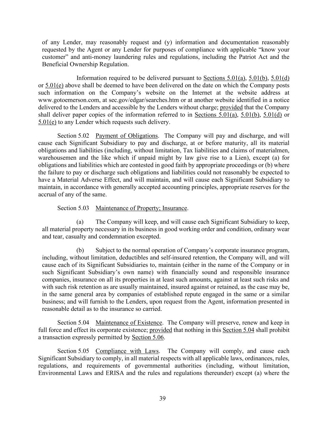 39 of any Lender, may reasonably request and (y) information and documentation reasonably requested by the Agent or any Lender for purposes of compliance with applicable “know your customer” and anti-money laundering rules and regulations, including the Patriot Act and the Beneficial Ownership Regulation. Information required to be delivered pursuant to Sections 5.01(a), 5.01(b), 5.01(d) or 5.01(e) above shall be deemed to have been delivered on the date on which the Company posts such information on the Company’s website on the Internet at the website address at www.gotoemerson.com, at sec.gov/edgar/searches.htm or at another website identified in a notice delivered to the Lenders and accessible by the Lenders without charge; provided that the Company shall deliver paper copies of the information referred to in Sections 5.01(a), 5.01(b), 5.01(d) or 5.01(e) to any Lender which requests such delivery. Section 5.02 Payment of Obligations. The Company will pay and discharge, and will cause each Significant Subsidiary to pay and discharge, at or before maturity, all its material obligations and liabilities (including, without limitation, Tax liabilities and claims of materialmen, warehousemen and the like which if unpaid might by law give rise to a Lien), except (a) for obligations and liabilities which are contested in good faith by appropriate proceedings or (b) where the failure to pay or discharge such obligations and liabilities could not reasonably be expected to have a Material Adverse Effect, and will maintain, and will cause each Significant Subsidiary to maintain, in accordance with generally accepted accounting principles, appropriate reserves for the accrual of any of the same. Section 5.03 Maintenance of Property; Insurance. (a) The Company will keep, and will cause each Significant Subsidiary to keep, all material property necessary in its business in good working order and condition, ordinary wear and tear, casualty and condemnation excepted. (b) Subject to the normal operation of Company’s corporate insurance program, including, without limitation, deductibles and self-insured retention, the Company will, and will cause each of its Significant Subsidiaries to, maintain (either in the name of the Company or in such Significant Subsidiary’s own name) with financially sound and responsible insurance companies, insurance on all its properties in at least such amounts, against at least such risks and with such risk retention as are usually maintained, insured against or retained, as the case may be, in the same general area by companies of established repute engaged in the same or a similar business; and will furnish to the Lenders, upon request from the Agent, information presented in reasonable detail as to the insurance so carried. Section 5.04 Maintenance of Existence. The Company will preserve, renew and keep in full force and effect its corporate existence; provided that nothing in this Section 5.04 shall prohibit a transaction expressly permitted by Section 5.06. Section 5.05 Compliance with Laws. The Company will comply, and cause each Significant Subsidiary to comply, in all material respects with all applicable laws, ordinances, rules, regulations, and requirements of governmental authorities (including, without limitation, Environmental Laws and ERISA and the rules and regulations thereunder) except (a) where the