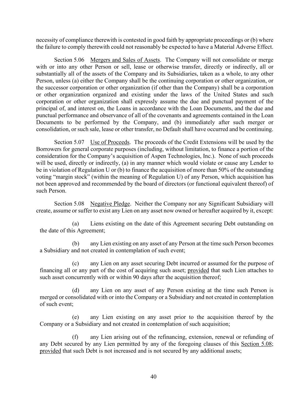 40 necessity of compliance therewith is contested in good faith by appropriate proceedings or (b) where the failure to comply therewith could not reasonably be expected to have a Material Adverse Effect. Section 5.06 Mergers and Sales of Assets. The Company will not consolidate or merge with or into any other Person or sell, lease or otherwise transfer, directly or indirectly, all or substantially all of the assets of the Company and its Subsidiaries, taken as a whole, to any other Person, unless (a) either the Company shall be the continuing corporation or other organization, or the successor corporation or other organization (if other than the Company) shall be a corporation or other organization organized and existing under the laws of the United States and such corporation or other organization shall expressly assume the due and punctual payment of the principal of, and interest on, the Loans in accordance with the Loan Documents, and the due and punctual performance and observance of all of the covenants and agreements contained in the Loan Documents to be performed by the Company, and (b) immediately after such merger or consolidation, or such sale, lease or other transfer, no Default shall have occurred and be continuing. Section 5.07 Use of Proceeds. The proceeds of the Credit Extensions will be used by the Borrowers for general corporate purposes (including, without limitation, to finance a portion of the consideration for the Company’s acquisition of Aspen Technologies, Inc.). None of such proceeds will be used, directly or indirectly, (a) in any manner which would violate or cause any Lender to be in violation of Regulation U or (b) to finance the acquisition of more than 50% of the outstanding voting “margin stock” (within the meaning of Regulation U) of any Person, which acquisition has not been approved and recommended by the board of directors (or functional equivalent thereof) of such Person. Section 5.08 Negative Pledge. Neither the Company nor any Significant Subsidiary will create, assume or suffer to exist any Lien on any asset now owned or hereafter acquired by it, except: (a) Liens existing on the date of this Agreement securing Debt outstanding on the date of this Agreement; (b) any Lien existing on any asset of any Person at the time such Person becomes a Subsidiary and not created in contemplation of such event; (c) any Lien on any asset securing Debt incurred or assumed for the purpose of financing all or any part of the cost of acquiring such asset; provided that such Lien attaches to such asset concurrently with or within 90 days after the acquisition thereof; (d) any Lien on any asset of any Person existing at the time such Person is merged or consolidated with or into the Company or a Subsidiary and not created in contemplation of such event; (e) any Lien existing on any asset prior to the acquisition thereof by the Company or a Subsidiary and not created in contemplation of such acquisition; (f) any Lien arising out of the refinancing, extension, renewal or refunding of any Debt secured by any Lien permitted by any of the foregoing clauses of this Section 5.08; provided that such Debt is not increased and is not secured by any additional assets;