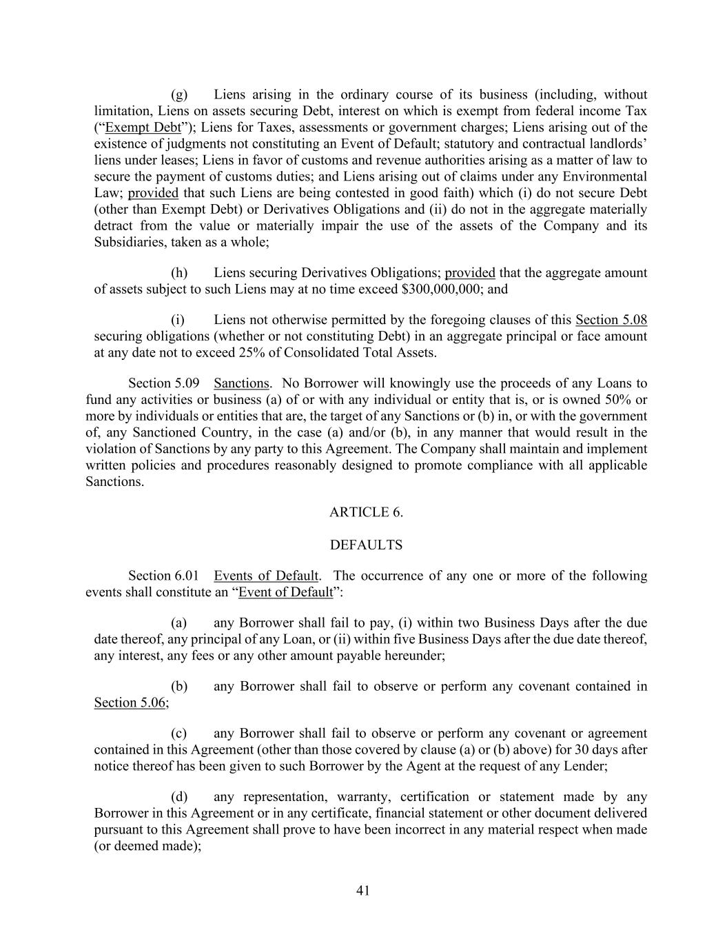 41 (g) Liens arising in the ordinary course of its business (including, without limitation, Liens on assets securing Debt, interest on which is exempt from federal income Tax (“Exempt Debt”); Liens for Taxes, assessments or government charges; Liens arising out of the existence of judgments not constituting an Event of Default; statutory and contractual landlords’ liens under leases; Liens in favor of customs and revenue authorities arising as a matter of law to secure the payment of customs duties; and Liens arising out of claims under any Environmental Law; provided that such Liens are being contested in good faith) which (i) do not secure Debt (other than Exempt Debt) or Derivatives Obligations and (ii) do not in the aggregate materially detract from the value or materially impair the use of the assets of the Company and its Subsidiaries, taken as a whole; (h) Liens securing Derivatives Obligations; provided that the aggregate amount of assets subject to such Liens may at no time exceed $300,000,000; and (i) Liens not otherwise permitted by the foregoing clauses of this Section 5.08 securing obligations (whether or not constituting Debt) in an aggregate principal or face amount at any date not to exceed 25% of Consolidated Total Assets. Section 5.09 Sanctions. No Borrower will knowingly use the proceeds of any Loans to fund any activities or business (a) of or with any individual or entity that is, or is owned 50% or more by individuals or entities that are, the target of any Sanctions or (b) in, or with the government of, any Sanctioned Country, in the case (a) and/or (b), in any manner that would result in the violation of Sanctions by any party to this Agreement. The Company shall maintain and implement written policies and procedures reasonably designed to promote compliance with all applicable Sanctions. ARTICLE 6. DEFAULTS Section 6.01 Events of Default. The occurrence of any one or more of the following events shall constitute an “Event of Default”: (a) any Borrower shall fail to pay, (i) within two Business Days after the due date thereof, any principal of any Loan, or (ii) within five Business Days after the due date thereof, any interest, any fees or any other amount payable hereunder; (b) any Borrower shall fail to observe or perform any covenant contained in Section 5.06; (c) any Borrower shall fail to observe or perform any covenant or agreement contained in this Agreement (other than those covered by clause (a) or (b) above) for 30 days after notice thereof has been given to such Borrower by the Agent at the request of any Lender; (d) any representation, warranty, certification or statement made by any Borrower in this Agreement or in any certificate, financial statement or other document delivered pursuant to this Agreement shall prove to have been incorrect in any material respect when made (or deemed made);