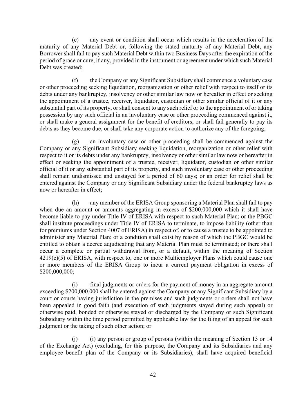 42 (e) any event or condition shall occur which results in the acceleration of the maturity of any Material Debt or, following the stated maturity of any Material Debt, any Borrower shall fail to pay such Material Debt within two Business Days after the expiration of the period of grace or cure, if any, provided in the instrument or agreement under which such Material Debt was created; (f) the Company or any Significant Subsidiary shall commence a voluntary case or other proceeding seeking liquidation, reorganization or other relief with respect to itself or its debts under any bankruptcy, insolvency or other similar law now or hereafter in effect or seeking the appointment of a trustee, receiver, liquidator, custodian or other similar official of it or any substantial part of its property, or shall consent to any such relief or to the appointment of or taking possession by any such official in an involuntary case or other proceeding commenced against it, or shall make a general assignment for the benefit of creditors, or shall fail generally to pay its debts as they become due, or shall take any corporate action to authorize any of the foregoing; (g) an involuntary case or other proceeding shall be commenced against the Company or any Significant Subsidiary seeking liquidation, reorganization or other relief with respect to it or its debts under any bankruptcy, insolvency or other similar law now or hereafter in effect or seeking the appointment of a trustee, receiver, liquidator, custodian or other similar official of it or any substantial part of its property, and such involuntary case or other proceeding shall remain undismissed and unstayed for a period of 60 days; or an order for relief shall be entered against the Company or any Significant Subsidiary under the federal bankruptcy laws as now or hereafter in effect; (h) any member of the ERISA Group sponsoring a Material Plan shall fail to pay when due an amount or amounts aggregating in excess of $200,000,000 which it shall have become liable to pay under Title IV of ERISA with respect to such Material Plan; or the PBGC shall institute proceedings under Title IV of ERISA to terminate, to impose liability (other than for premiums under Section 4007 of ERISA) in respect of, or to cause a trustee to be appointed to administer any Material Plan; or a condition shall exist by reason of which the PBGC would be entitled to obtain a decree adjudicating that any Material Plan must be terminated; or there shall occur a complete or partial withdrawal from, or a default, within the meaning of Section 4219(c)(5) of ERISA, with respect to, one or more Multiemployer Plans which could cause one or more members of the ERISA Group to incur a current payment obligation in excess of $200,000,000; (i) final judgments or orders for the payment of money in an aggregate amount exceeding $200,000,000 shall be entered against the Company or any Significant Subsidiary by a court or courts having jurisdiction in the premises and such judgments or orders shall not have been appealed in good faith (and execution of such judgments stayed during such appeal) or otherwise paid, bonded or otherwise stayed or discharged by the Company or such Significant Subsidiary within the time period permitted by applicable law for the filing of an appeal for such judgment or the taking of such other action; or (j) (i) any person or group of persons (within the meaning of Section 13 or 14 of the Exchange Act) (excluding, for this purpose, the Company and its Subsidiaries and any employee benefit plan of the Company or its Subsidiaries), shall have acquired beneficial