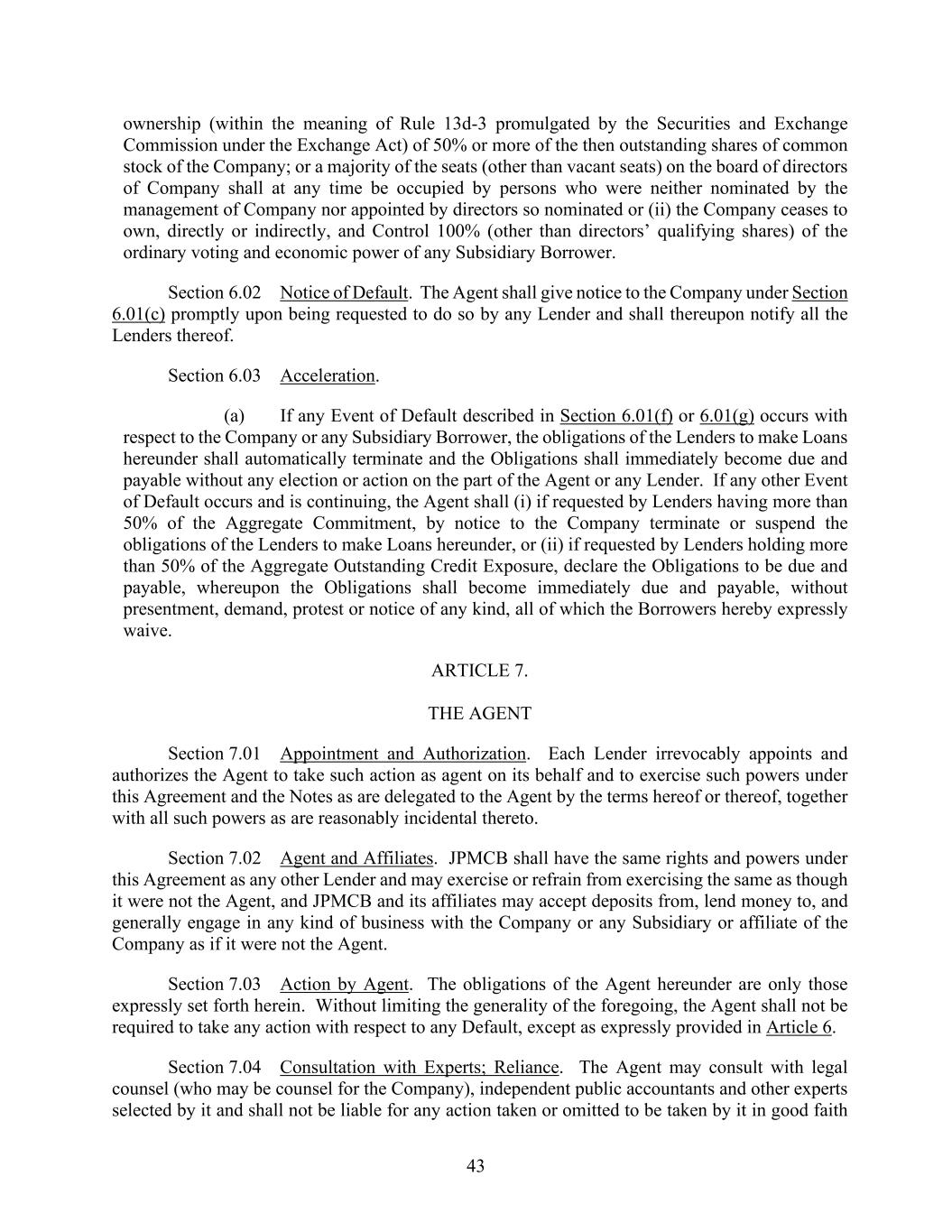 43 ownership (within the meaning of Rule 13d-3 promulgated by the Securities and Exchange Commission under the Exchange Act) of 50% or more of the then outstanding shares of common stock of the Company; or a majority of the seats (other than vacant seats) on the board of directors of Company shall at any time be occupied by persons who were neither nominated by the management of Company nor appointed by directors so nominated or (ii) the Company ceases to own, directly or indirectly, and Control 100% (other than directors’ qualifying shares) of the ordinary voting and economic power of any Subsidiary Borrower. Section 6.02 Notice of Default. The Agent shall give notice to the Company under Section 6.01(c) promptly upon being requested to do so by any Lender and shall thereupon notify all the Lenders thereof. Section 6.03 Acceleration. (a) If any Event of Default described in Section 6.01(f) or 6.01(g) occurs with respect to the Company or any Subsidiary Borrower, the obligations of the Lenders to make Loans hereunder shall automatically terminate and the Obligations shall immediately become due and payable without any election or action on the part of the Agent or any Lender. If any other Event of Default occurs and is continuing, the Agent shall (i) if requested by Lenders having more than 50% of the Aggregate Commitment, by notice to the Company terminate or suspend the obligations of the Lenders to make Loans hereunder, or (ii) if requested by Lenders holding more than 50% of the Aggregate Outstanding Credit Exposure, declare the Obligations to be due and payable, whereupon the Obligations shall become immediately due and payable, without presentment, demand, protest or notice of any kind, all of which the Borrowers hereby expressly waive. ARTICLE 7. THE AGENT Section 7.01 Appointment and Authorization. Each Lender irrevocably appoints and authorizes the Agent to take such action as agent on its behalf and to exercise such powers under this Agreement and the Notes as are delegated to the Agent by the terms hereof or thereof, together with all such powers as are reasonably incidental thereto. Section 7.02 Agent and Affiliates. JPMCB shall have the same rights and powers under this Agreement as any other Lender and may exercise or refrain from exercising the same as though it were not the Agent, and JPMCB and its affiliates may accept deposits from, lend money to, and generally engage in any kind of business with the Company or any Subsidiary or affiliate of the Company as if it were not the Agent. Section 7.03 Action by Agent. The obligations of the Agent hereunder are only those expressly set forth herein. Without limiting the generality of the foregoing, the Agent shall not be required to take any action with respect to any Default, except as expressly provided in Article 6. Section 7.04 Consultation with Experts; Reliance. The Agent may consult with legal counsel (who may be counsel for the Company), independent public accountants and other experts selected by it and shall not be liable for any action taken or omitted to be taken by it in good faith