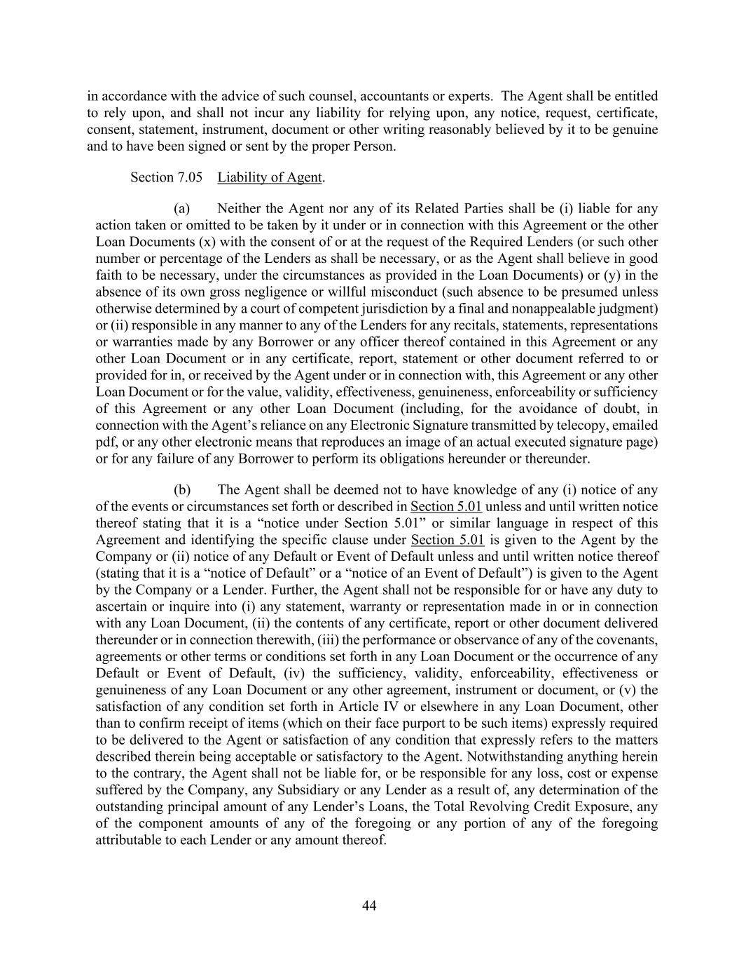 44 in accordance with the advice of such counsel, accountants or experts. The Agent shall be entitled to rely upon, and shall not incur any liability for relying upon, any notice, request, certificate, consent, statement, instrument, document or other writing reasonably believed by it to be genuine and to have been signed or sent by the proper Person. Section 7.05 Liability of Agent. (a) Neither the Agent nor any of its Related Parties shall be (i) liable for any action taken or omitted to be taken by it under or in connection with this Agreement or the other Loan Documents (x) with the consent of or at the request of the Required Lenders (or such other number or percentage of the Lenders as shall be necessary, or as the Agent shall believe in good faith to be necessary, under the circumstances as provided in the Loan Documents) or (y) in the absence of its own gross negligence or willful misconduct (such absence to be presumed unless otherwise determined by a court of competent jurisdiction by a final and nonappealable judgment) or (ii) responsible in any manner to any of the Lenders for any recitals, statements, representations or warranties made by any Borrower or any officer thereof contained in this Agreement or any other Loan Document or in any certificate, report, statement or other document referred to or provided for in, or received by the Agent under or in connection with, this Agreement or any other Loan Document or for the value, validity, effectiveness, genuineness, enforceability or sufficiency of this Agreement or any other Loan Document (including, for the avoidance of doubt, in connection with the Agent’s reliance on any Electronic Signature transmitted by telecopy, emailed pdf, or any other electronic means that reproduces an image of an actual executed signature page) or for any failure of any Borrower to perform its obligations hereunder or thereunder. (b) The Agent shall be deemed not to have knowledge of any (i) notice of any of the events or circumstances set forth or described in Section 5.01 unless and until written notice thereof stating that it is a “notice under Section 5.01” or similar language in respect of this Agreement and identifying the specific clause under Section 5.01 is given to the Agent by the Company or (ii) notice of any Default or Event of Default unless and until written notice thereof (stating that it is a “notice of Default” or a “notice of an Event of Default”) is given to the Agent by the Company or a Lender. Further, the Agent shall not be responsible for or have any duty to ascertain or inquire into (i) any statement, warranty or representation made in or in connection with any Loan Document, (ii) the contents of any certificate, report or other document delivered thereunder or in connection therewith, (iii) the performance or observance of any of the covenants, agreements or other terms or conditions set forth in any Loan Document or the occurrence of any Default or Event of Default, (iv) the sufficiency, validity, enforceability, effectiveness or genuineness of any Loan Document or any other agreement, instrument or document, or (v) the satisfaction of any condition set forth in Article IV or elsewhere in any Loan Document, other than to confirm receipt of items (which on their face purport to be such items) expressly required to be delivered to the Agent or satisfaction of any condition that expressly refers to the matters described therein being acceptable or satisfactory to the Agent. Notwithstanding anything herein to the contrary, the Agent shall not be liable for, or be responsible for any loss, cost or expense suffered by the Company, any Subsidiary or any Lender as a result of, any determination of the outstanding principal amount of any Lender’s Loans, the Total Revolving Credit Exposure, any of the component amounts of any of the foregoing or any portion of any of the foregoing attributable to each Lender or any amount thereof.