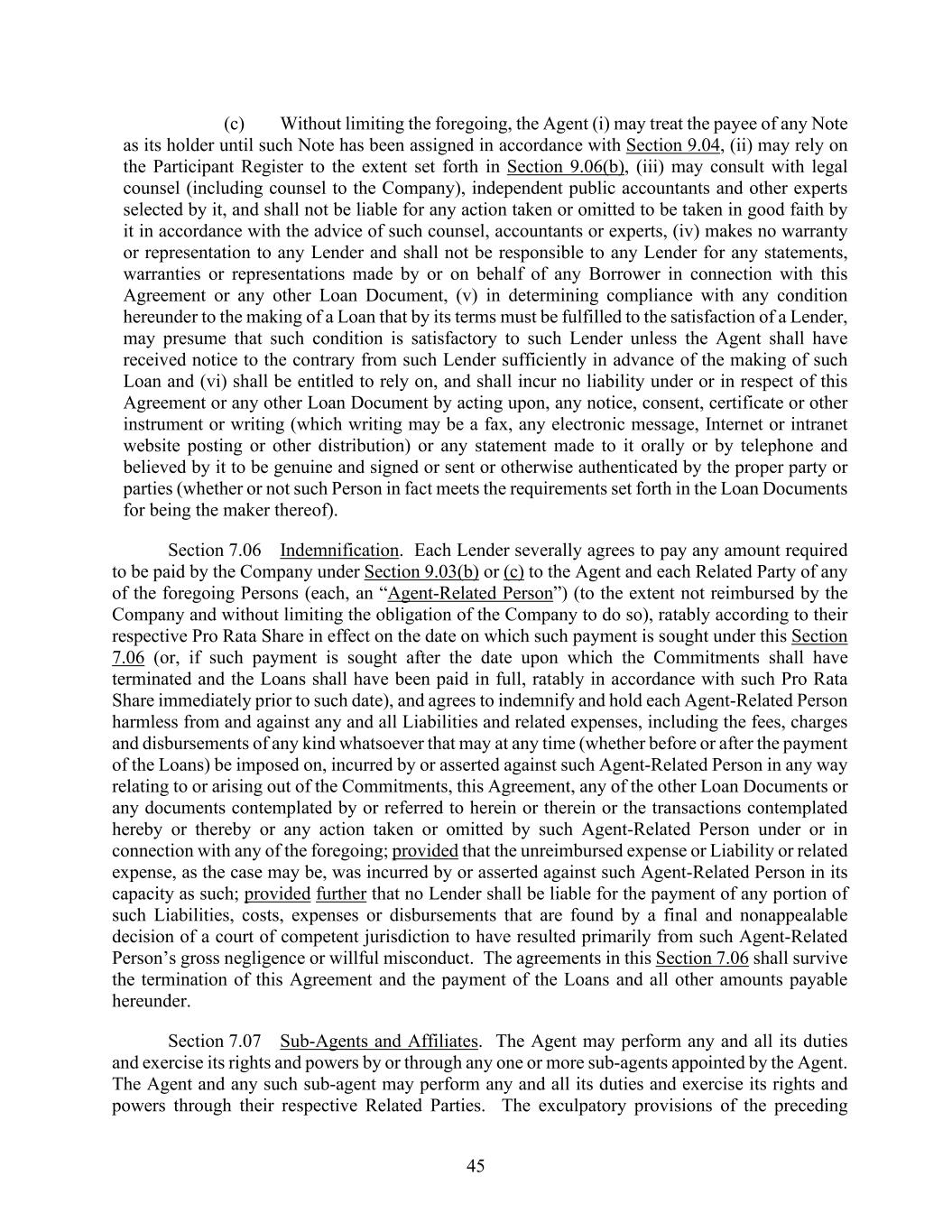45 (c) Without limiting the foregoing, the Agent (i) may treat the payee of any Note as its holder until such Note has been assigned in accordance with Section 9.04, (ii) may rely on the Participant Register to the extent set forth in Section 9.06(b), (iii) may consult with legal counsel (including counsel to the Company), independent public accountants and other experts selected by it, and shall not be liable for any action taken or omitted to be taken in good faith by it in accordance with the advice of such counsel, accountants or experts, (iv) makes no warranty or representation to any Lender and shall not be responsible to any Lender for any statements, warranties or representations made by or on behalf of any Borrower in connection with this Agreement or any other Loan Document, (v) in determining compliance with any condition hereunder to the making of a Loan that by its terms must be fulfilled to the satisfaction of a Lender, may presume that such condition is satisfactory to such Lender unless the Agent shall have received notice to the contrary from such Lender sufficiently in advance of the making of such Loan and (vi) shall be entitled to rely on, and shall incur no liability under or in respect of this Agreement or any other Loan Document by acting upon, any notice, consent, certificate or other instrument or writing (which writing may be a fax, any electronic message, Internet or intranet website posting or other distribution) or any statement made to it orally or by telephone and believed by it to be genuine and signed or sent or otherwise authenticated by the proper party or parties (whether or not such Person in fact meets the requirements set forth in the Loan Documents for being the maker thereof). Section 7.06 Indemnification. Each Lender severally agrees to pay any amount required to be paid by the Company under Section 9.03(b) or (c) to the Agent and each Related Party of any of the foregoing Persons (each, an “Agent-Related Person”) (to the extent not reimbursed by the Company and without limiting the obligation of the Company to do so), ratably according to their respective Pro Rata Share in effect on the date on which such payment is sought under this Section 7.06 (or, if such payment is sought after the date upon which the Commitments shall have terminated and the Loans shall have been paid in full, ratably in accordance with such Pro Rata Share immediately prior to such date), and agrees to indemnify and hold each Agent-Related Person harmless from and against any and all Liabilities and related expenses, including the fees, charges and disbursements of any kind whatsoever that may at any time (whether before or after the payment of the Loans) be imposed on, incurred by or asserted against such Agent-Related Person in any way relating to or arising out of the Commitments, this Agreement, any of the other Loan Documents or any documents contemplated by or referred to herein or therein or the transactions contemplated hereby or thereby or any action taken or omitted by such Agent-Related Person under or in connection with any of the foregoing; provided that the unreimbursed expense or Liability or related expense, as the case may be, was incurred by or asserted against such Agent-Related Person in its capacity as such; provided further that no Lender shall be liable for the payment of any portion of such Liabilities, costs, expenses or disbursements that are found by a final and nonappealable decision of a court of competent jurisdiction to have resulted primarily from such Agent-Related Person’s gross negligence or willful misconduct. The agreements in this Section 7.06 shall survive the termination of this Agreement and the payment of the Loans and all other amounts payable hereunder. Section 7.07 Sub-Agents and Affiliates. The Agent may perform any and all its duties and exercise its rights and powers by or through any one or more sub-agents appointed by the Agent. The Agent and any such sub-agent may perform any and all its duties and exercise its rights and powers through their respective Related Parties. The exculpatory provisions of the preceding