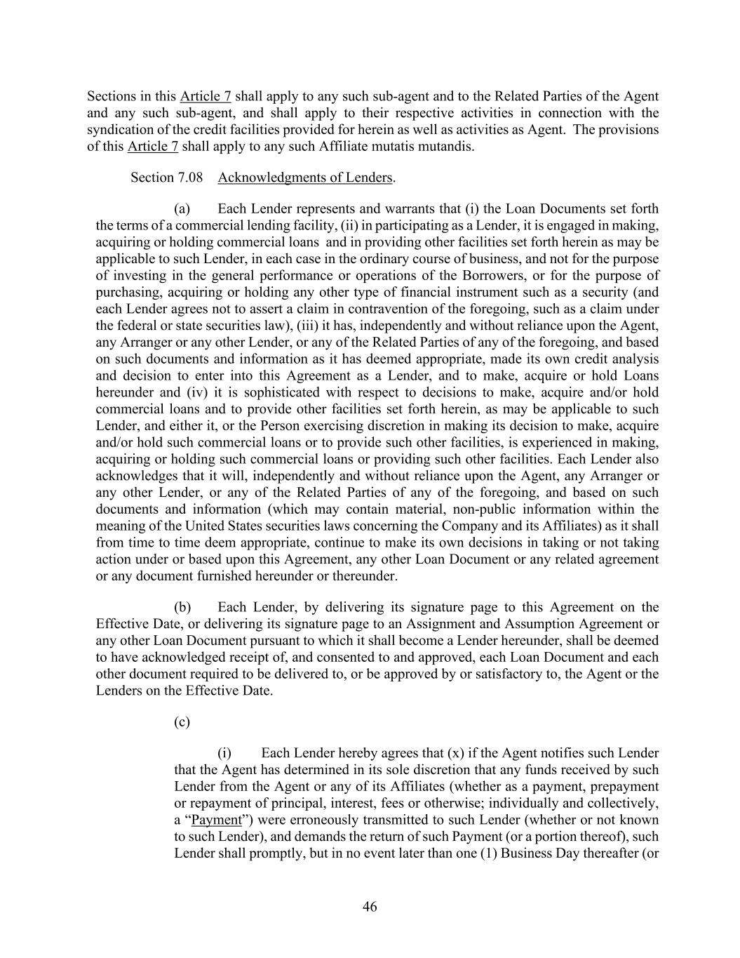 46 Sections in this Article 7 shall apply to any such sub-agent and to the Related Parties of the Agent and any such sub-agent, and shall apply to their respective activities in connection with the syndication of the credit facilities provided for herein as well as activities as Agent. The provisions of this Article 7 shall apply to any such Affiliate mutatis mutandis. Section 7.08 Acknowledgments of Lenders. (a) Each Lender represents and warrants that (i) the Loan Documents set forth the terms of a commercial lending facility, (ii) in participating as a Lender, it is engaged in making, acquiring or holding commercial loans and in providing other facilities set forth herein as may be applicable to such Lender, in each case in the ordinary course of business, and not for the purpose of investing in the general performance or operations of the Borrowers, or for the purpose of purchasing, acquiring or holding any other type of financial instrument such as a security (and each Lender agrees not to assert a claim in contravention of the foregoing, such as a claim under the federal or state securities law), (iii) it has, independently and without reliance upon the Agent, any Arranger or any other Lender, or any of the Related Parties of any of the foregoing, and based on such documents and information as it has deemed appropriate, made its own credit analysis and decision to enter into this Agreement as a Lender, and to make, acquire or hold Loans hereunder and (iv) it is sophisticated with respect to decisions to make, acquire and/or hold commercial loans and to provide other facilities set forth herein, as may be applicable to such Lender, and either it, or the Person exercising discretion in making its decision to make, acquire and/or hold such commercial loans or to provide such other facilities, is experienced in making, acquiring or holding such commercial loans or providing such other facilities. Each Lender also acknowledges that it will, independently and without reliance upon the Agent, any Arranger or any other Lender, or any of the Related Parties of any of the foregoing, and based on such documents and information (which may contain material, non-public information within the meaning of the United States securities laws concerning the Company and its Affiliates) as it shall from time to time deem appropriate, continue to make its own decisions in taking or not taking action under or based upon this Agreement, any other Loan Document or any related agreement or any document furnished hereunder or thereunder. (b) Each Lender, by delivering its signature page to this Agreement on the Effective Date, or delivering its signature page to an Assignment and Assumption Agreement or any other Loan Document pursuant to which it shall become a Lender hereunder, shall be deemed to have acknowledged receipt of, and consented to and approved, each Loan Document and each other document required to be delivered to, or be approved by or satisfactory to, the Agent or the Lenders on the Effective Date. (c) (i) Each Lender hereby agrees that (x) if the Agent notifies such Lender that the Agent has determined in its sole discretion that any funds received by such Lender from the Agent or any of its Affiliates (whether as a payment, prepayment or repayment of principal, interest, fees or otherwise; individually and collectively, a “Payment”) were erroneously transmitted to such Lender (whether or not known to such Lender), and demands the return of such Payment (or a portion thereof), such Lender shall promptly, but in no event later than one (1) Business Day thereafter (or