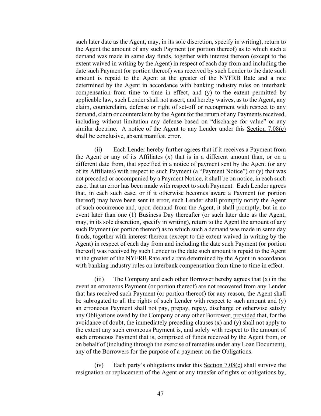 47 such later date as the Agent, may, in its sole discretion, specify in writing), return to the Agent the amount of any such Payment (or portion thereof) as to which such a demand was made in same day funds, together with interest thereon (except to the extent waived in writing by the Agent) in respect of each day from and including the date such Payment (or portion thereof) was received by such Lender to the date such amount is repaid to the Agent at the greater of the NYFRB Rate and a rate determined by the Agent in accordance with banking industry rules on interbank compensation from time to time in effect, and (y) to the extent permitted by applicable law, such Lender shall not assert, and hereby waives, as to the Agent, any claim, counterclaim, defense or right of set-off or recoupment with respect to any demand, claim or counterclaim by the Agent for the return of any Payments received, including without limitation any defense based on “discharge for value” or any similar doctrine. A notice of the Agent to any Lender under this Section 7.08(c) shall be conclusive, absent manifest error. (ii) Each Lender hereby further agrees that if it receives a Payment from the Agent or any of its Affiliates (x) that is in a different amount than, or on a different date from, that specified in a notice of payment sent by the Agent (or any of its Affiliates) with respect to such Payment (a “Payment Notice”) or (y) that was not preceded or accompanied by a Payment Notice, it shall be on notice, in each such case, that an error has been made with respect to such Payment. Each Lender agrees that, in each such case, or if it otherwise becomes aware a Payment (or portion thereof) may have been sent in error, such Lender shall promptly notify the Agent of such occurrence and, upon demand from the Agent, it shall promptly, but in no event later than one (1) Business Day thereafter (or such later date as the Agent, may, in its sole discretion, specify in writing), return to the Agent the amount of any such Payment (or portion thereof) as to which such a demand was made in same day funds, together with interest thereon (except to the extent waived in writing by the Agent) in respect of each day from and including the date such Payment (or portion thereof) was received by such Lender to the date such amount is repaid to the Agent at the greater of the NYFRB Rate and a rate determined by the Agent in accordance with banking industry rules on interbank compensation from time to time in effect. (iii) The Company and each other Borrower hereby agrees that (x) in the event an erroneous Payment (or portion thereof) are not recovered from any Lender that has received such Payment (or portion thereof) for any reason, the Agent shall be subrogated to all the rights of such Lender with respect to such amount and (y) an erroneous Payment shall not pay, prepay, repay, discharge or otherwise satisfy any Obligations owed by the Company or any other Borrower; provided that, for the avoidance of doubt, the immediately preceding clauses (x) and (y) shall not apply to the extent any such erroneous Payment is, and solely with respect to the amount of such erroneous Payment that is, comprised of funds received by the Agent from, or on behalf of (including through the exercise of remedies under any Loan Document), any of the Borrowers for the purpose of a payment on the Obligations. (iv) Each party’s obligations under this Section 7.08(c) shall survive the resignation or replacement of the Agent or any transfer of rights or obligations by,