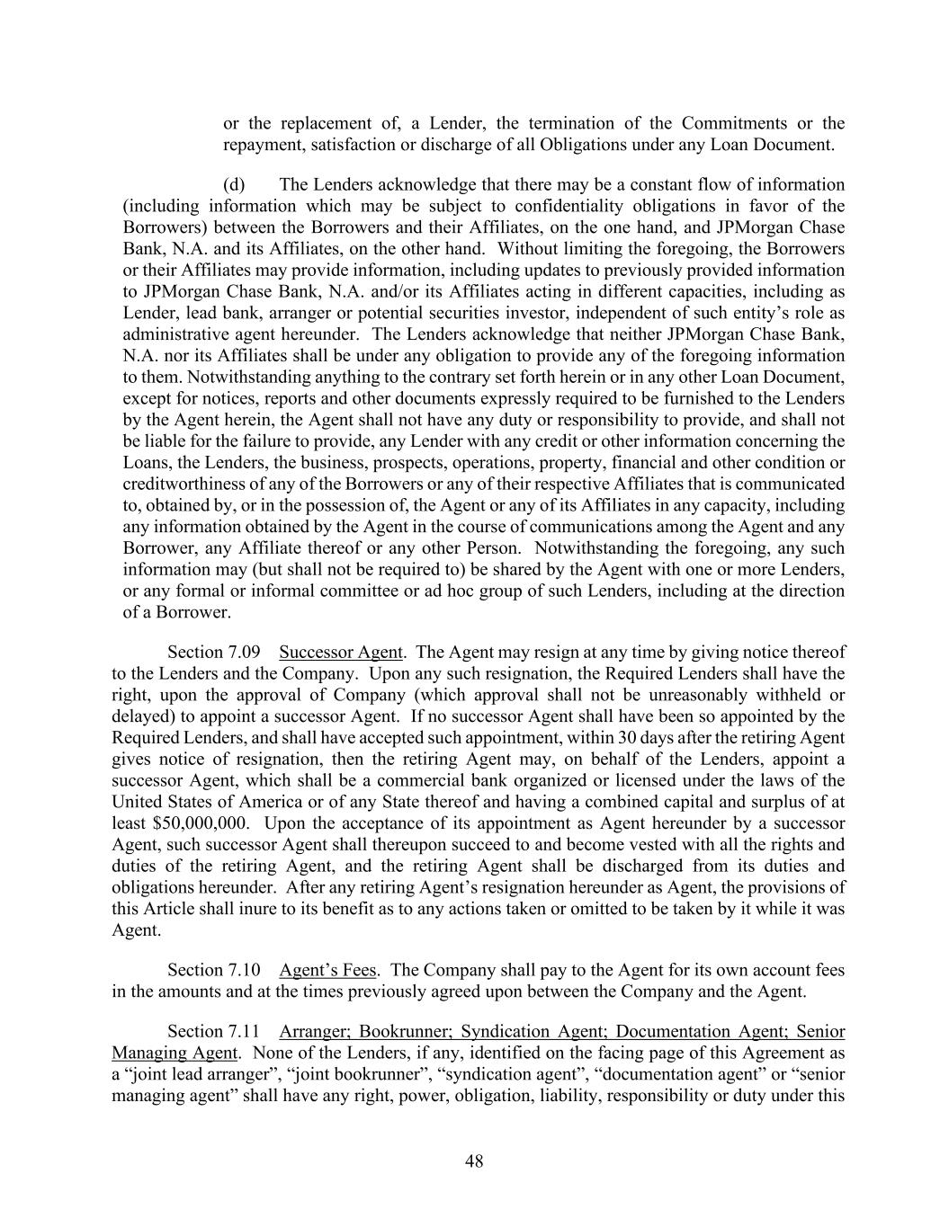 48 or the replacement of, a Lender, the termination of the Commitments or the repayment, satisfaction or discharge of all Obligations under any Loan Document. (d) The Lenders acknowledge that there may be a constant flow of information (including information which may be subject to confidentiality obligations in favor of the Borrowers) between the Borrowers and their Affiliates, on the one hand, and JPMorgan Chase Bank, N.A. and its Affiliates, on the other hand. Without limiting the foregoing, the Borrowers or their Affiliates may provide information, including updates to previously provided information to JPMorgan Chase Bank, N.A. and/or its Affiliates acting in different capacities, including as Lender, lead bank, arranger or potential securities investor, independent of such entity’s role as administrative agent hereunder. The Lenders acknowledge that neither JPMorgan Chase Bank, N.A. nor its Affiliates shall be under any obligation to provide any of the foregoing information to them. Notwithstanding anything to the contrary set forth herein or in any other Loan Document, except for notices, reports and other documents expressly required to be furnished to the Lenders by the Agent herein, the Agent shall not have any duty or responsibility to provide, and shall not be liable for the failure to provide, any Lender with any credit or other information concerning the Loans, the Lenders, the business, prospects, operations, property, financial and other condition or creditworthiness of any of the Borrowers or any of their respective Affiliates that is communicated to, obtained by, or in the possession of, the Agent or any of its Affiliates in any capacity, including any information obtained by the Agent in the course of communications among the Agent and any Borrower, any Affiliate thereof or any other Person. Notwithstanding the foregoing, any such information may (but shall not be required to) be shared by the Agent with one or more Lenders, or any formal or informal committee or ad hoc group of such Lenders, including at the direction of a Borrower. Section 7.09 Successor Agent. The Agent may resign at any time by giving notice thereof to the Lenders and the Company. Upon any such resignation, the Required Lenders shall have the right, upon the approval of Company (which approval shall not be unreasonably withheld or delayed) to appoint a successor Agent. If no successor Agent shall have been so appointed by the Required Lenders, and shall have accepted such appointment, within 30 days after the retiring Agent gives notice of resignation, then the retiring Agent may, on behalf of the Lenders, appoint a successor Agent, which shall be a commercial bank organized or licensed under the laws of the United States of America or of any State thereof and having a combined capital and surplus of at least $50,000,000. Upon the acceptance of its appointment as Agent hereunder by a successor Agent, such successor Agent shall thereupon succeed to and become vested with all the rights and duties of the retiring Agent, and the retiring Agent shall be discharged from its duties and obligations hereunder. After any retiring Agent’s resignation hereunder as Agent, the provisions of this Article shall inure to its benefit as to any actions taken or omitted to be taken by it while it was Agent. Section 7.10 Agent’s Fees. The Company shall pay to the Agent for its own account fees in the amounts and at the times previously agreed upon between the Company and the Agent. Section 7.11 Arranger; Bookrunner; Syndication Agent; Documentation Agent; Senior Managing Agent. None of the Lenders, if any, identified on the facing page of this Agreement as a “joint lead arranger”, “joint bookrunner”, “syndication agent”, “documentation agent” or “senior managing agent” shall have any right, power, obligation, liability, responsibility or duty under this